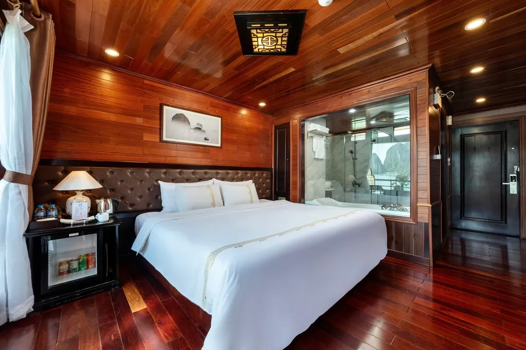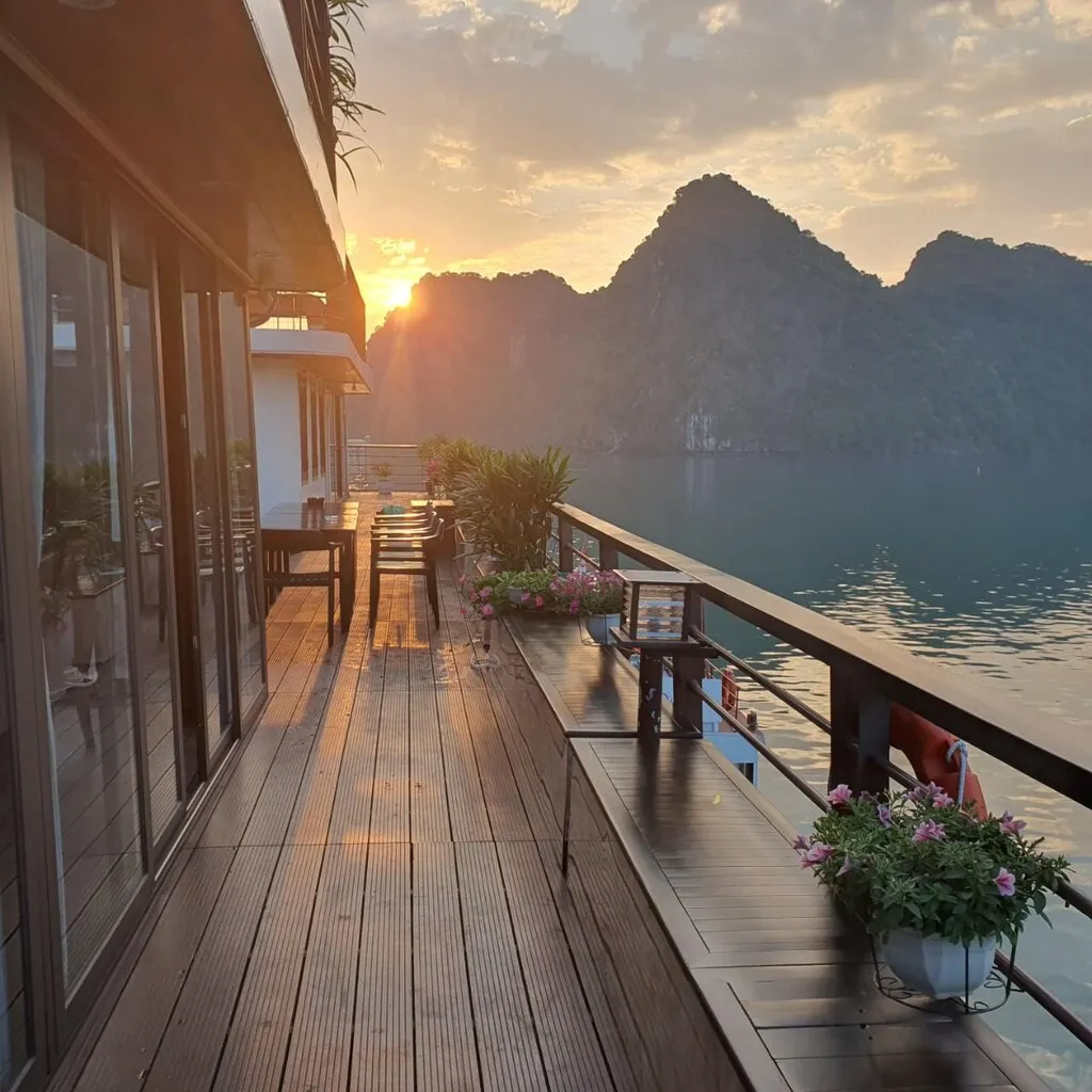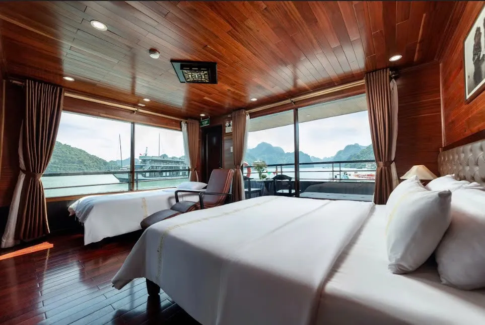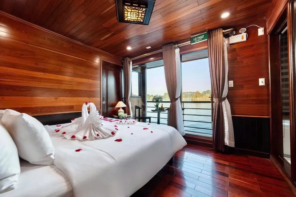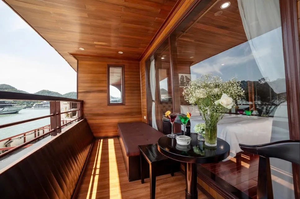 Hầu hết các phòng nghỉ trên du thuyền đều sở hữu ban công riêng hướng vịnh. Đây là không gian lý tưởng để du khách đón bình minh ngay tại giường hoặc nhâm nhi ly rượu vang và ngắm nhìn những dãy núi đá vôi kỳ vĩ trong không gian riêng tư hoàn toàn.
