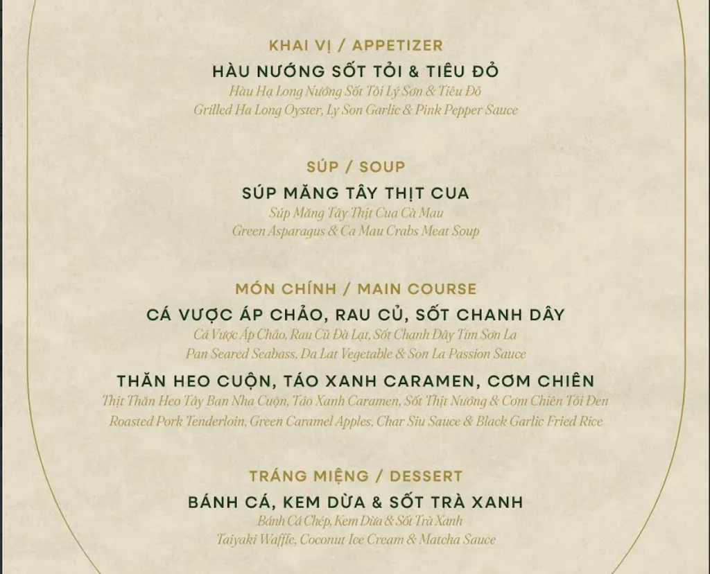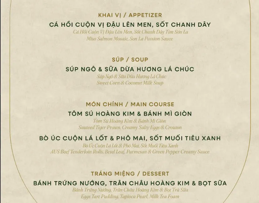 Hiện thân của nền văn hóa cung đình miền Trung thanh lịch. Không gian được trang hoàng với thiết kế truyền thống, họa tiết chạm khắc gỗ tinh xảo và các motif cổ điển, kết nối di sản với tinh hoa ẩm thực hiện đại.