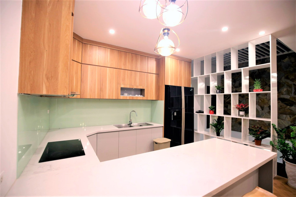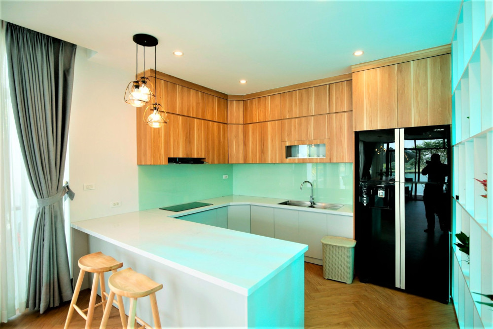 Phòng khách và bếp được bố trí tiện nghi: TV truyền hình cáp, wifi, khu vực nấu ăn đầy đủ dụng cụ rất phù hợp cho nhóm bạn hoặc gia đình muốn tự tổ chức bữa tiệc nhỏ.