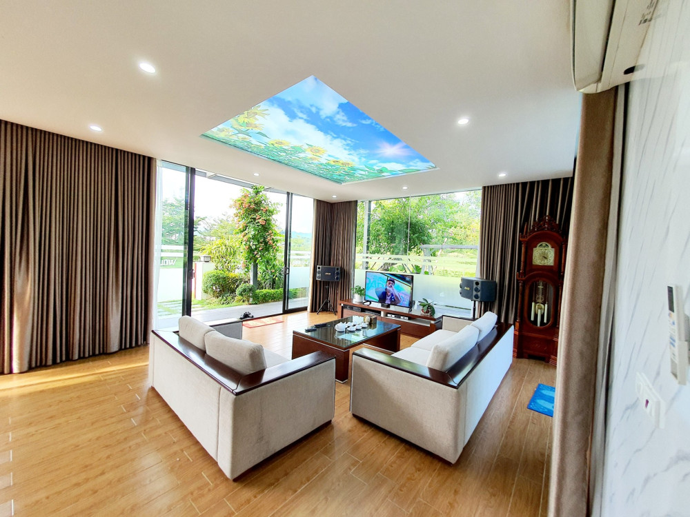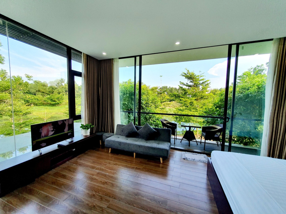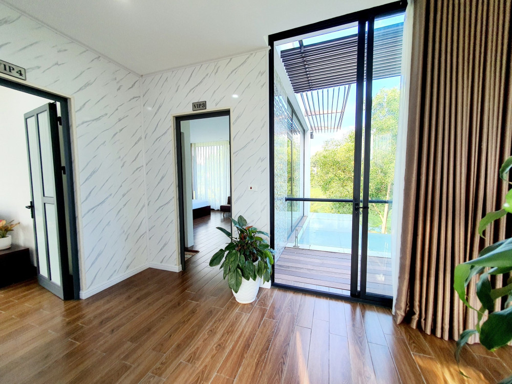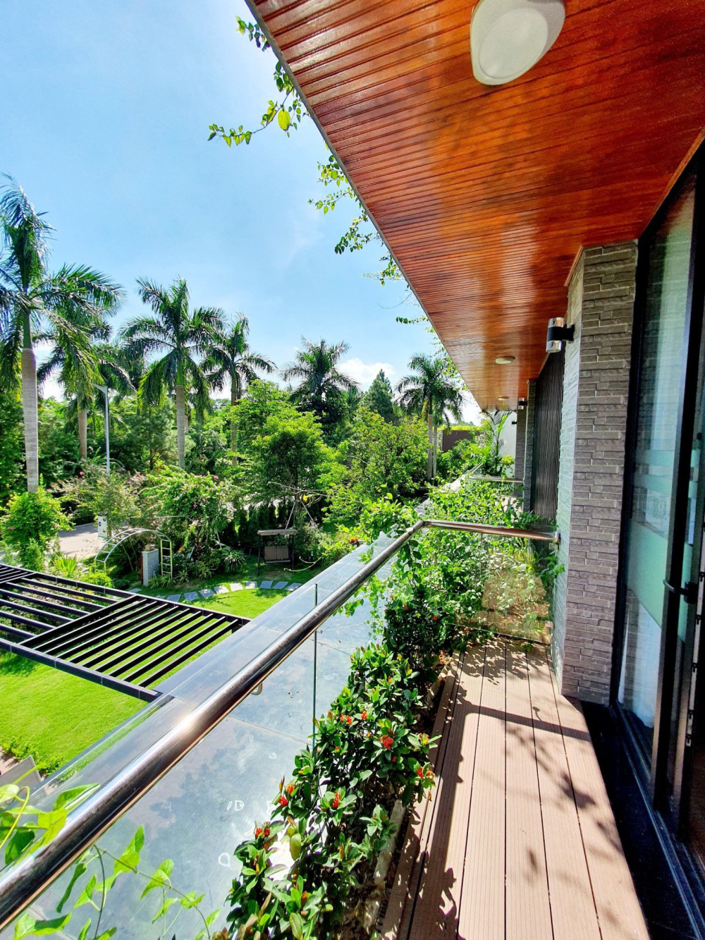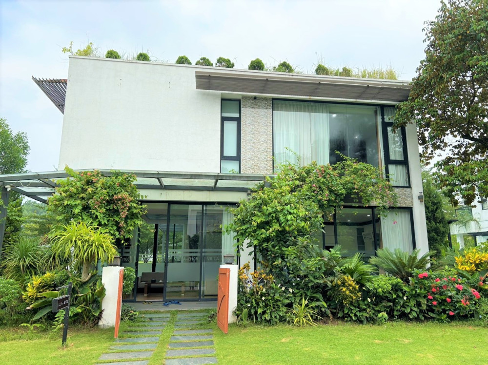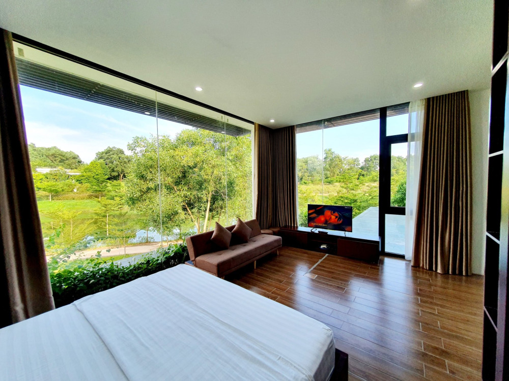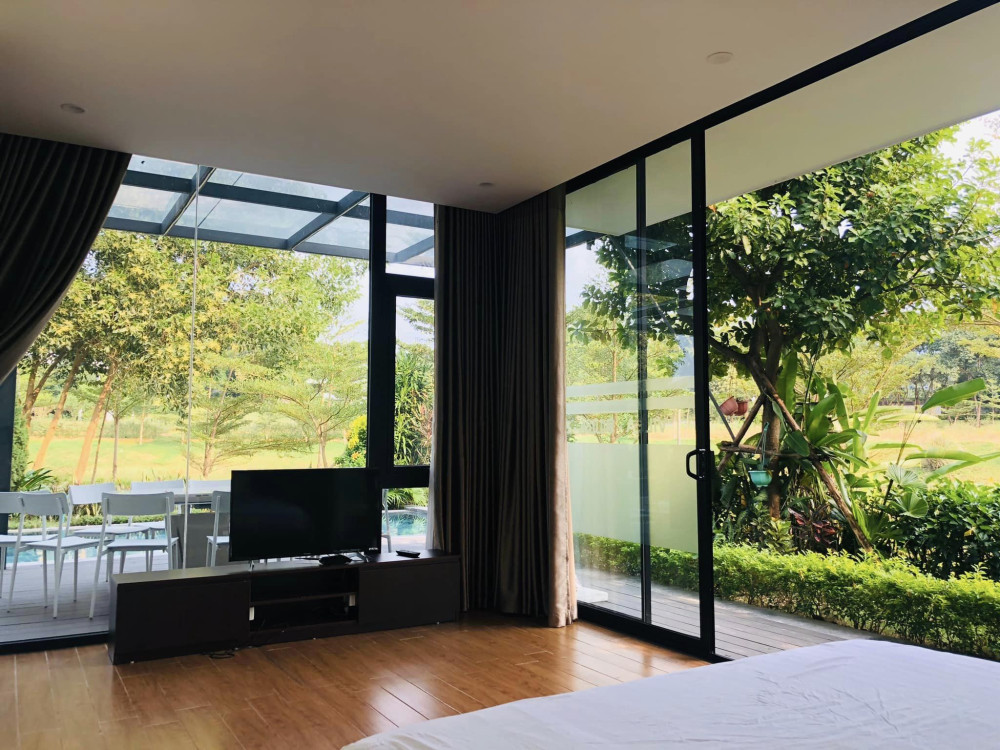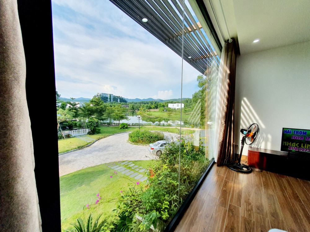 Biệt thự thiết kế theo phong cách mở, sử dụng tông màu trắng – nâu gỗ hiện đại, tạo cảm giác sang trọng mà vẫn gần gũi với thiên nhiên. Ban công tầng 2 có view nhìn thẳng ra khu rừng thông và hồ nước – nơi lý tưởng để ngắm bình minh hoặc thưởng thức cà phê sáng.