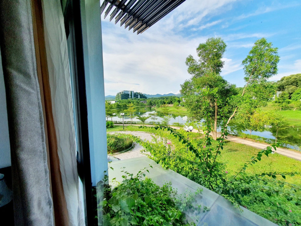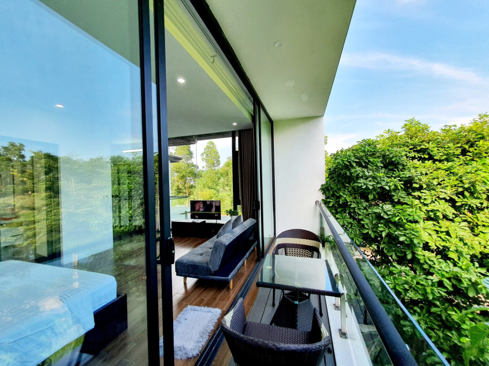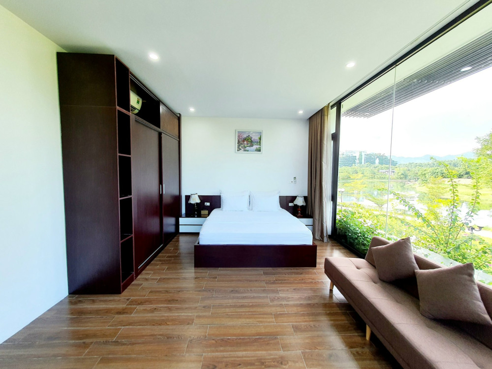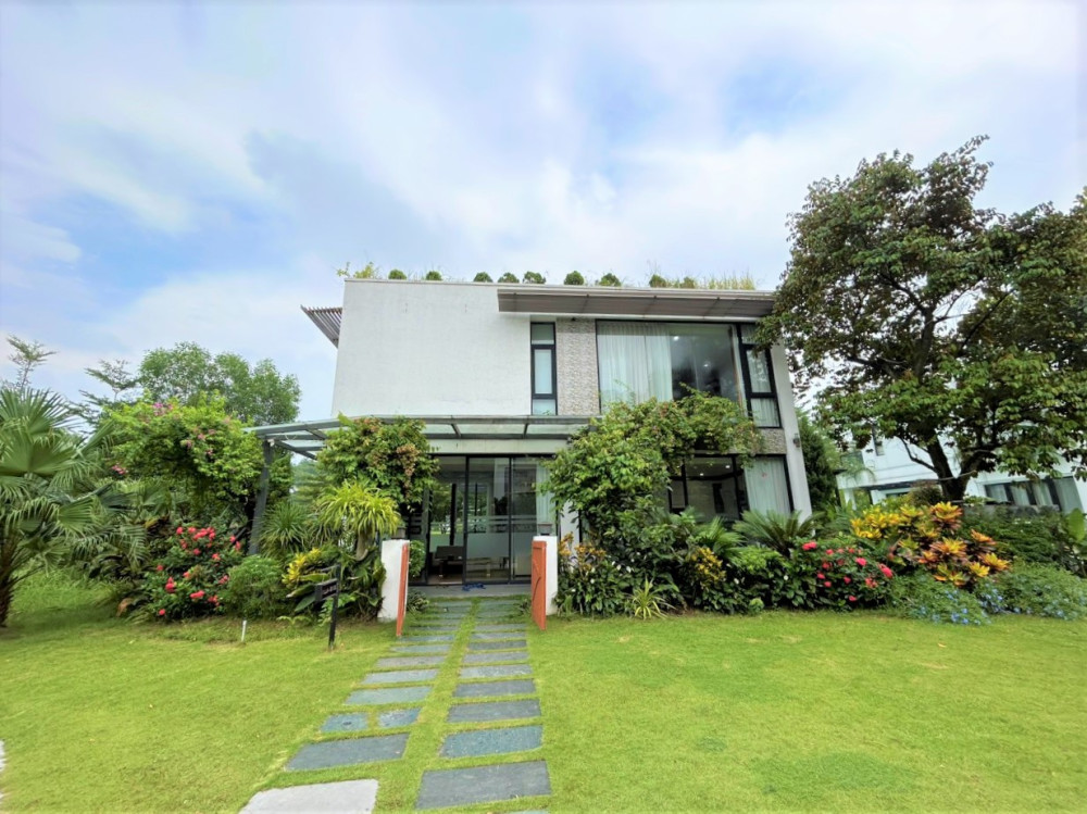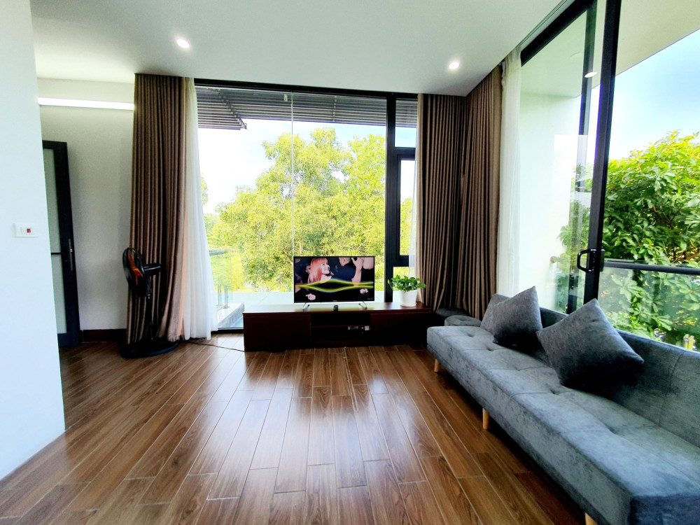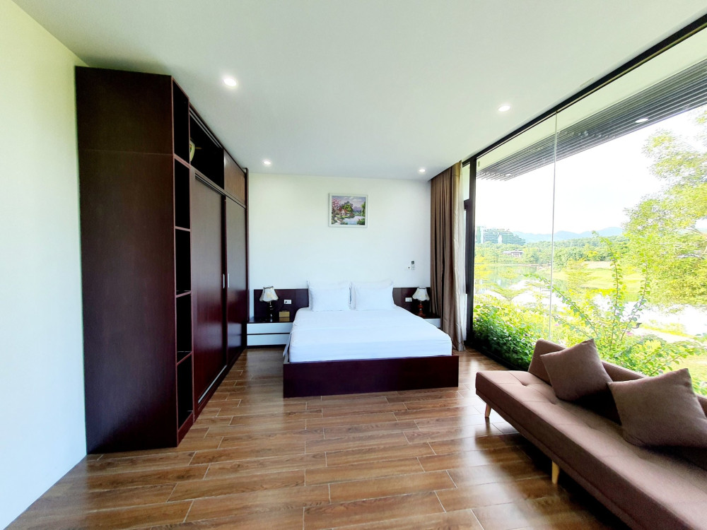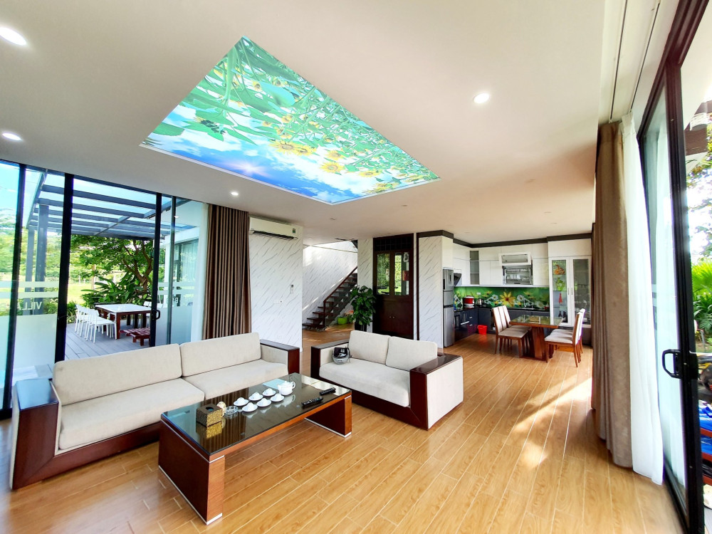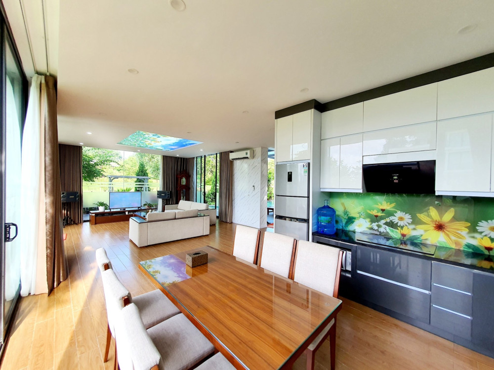 Biệt thự thiết kế theo phong cách mở, sử dụng tông màu trắng – nâu gỗ hiện đại, tạo cảm giác sang trọng mà vẫn gần gũi với thiên nhiên. Ban công tầng 2 có view nhìn thẳng ra khu rừng thông và hồ nước – nơi lý tưởng để ngắm bình minh hoặc thưởng thức cà phê sáng.