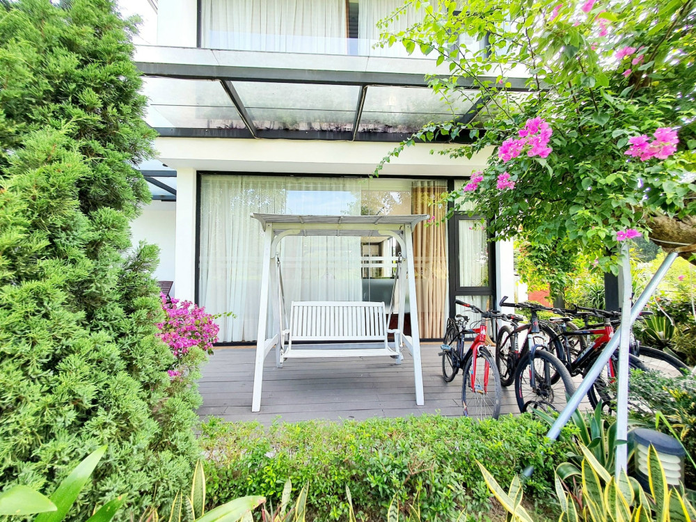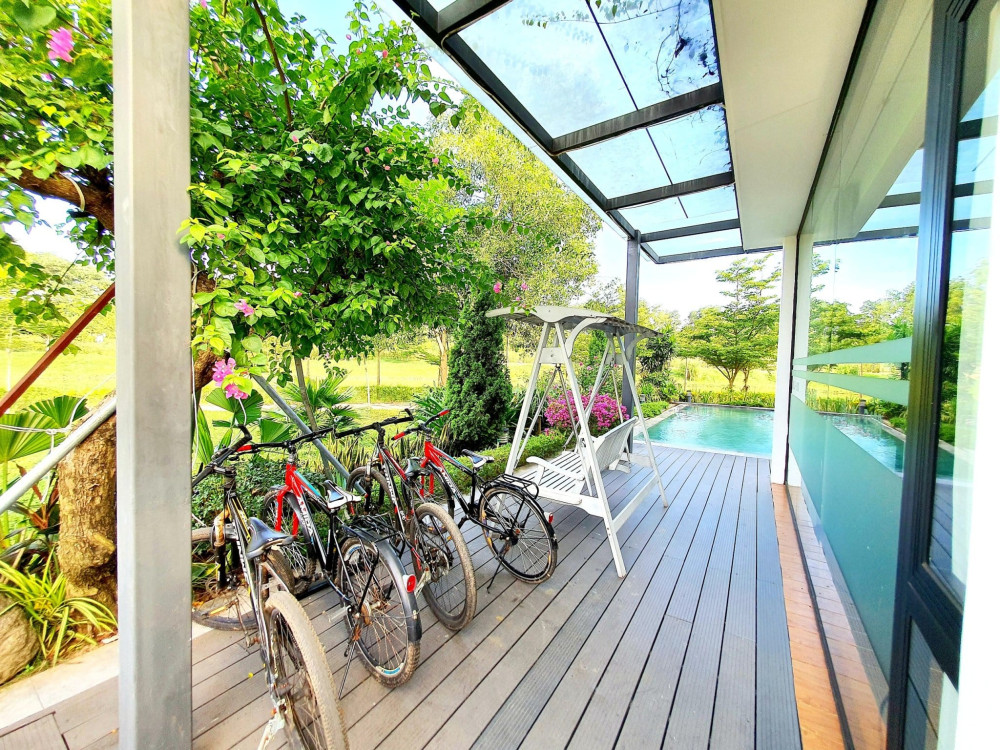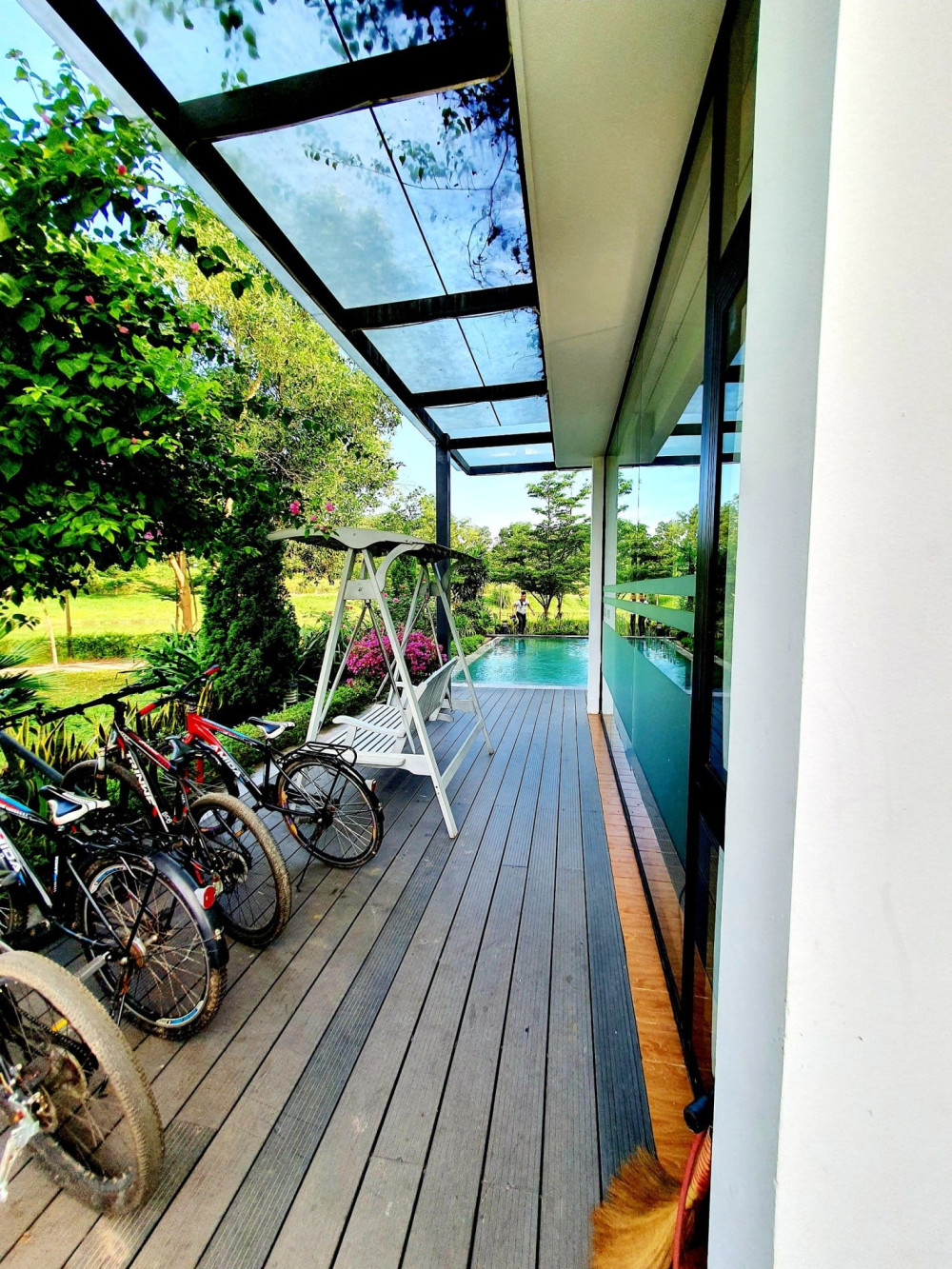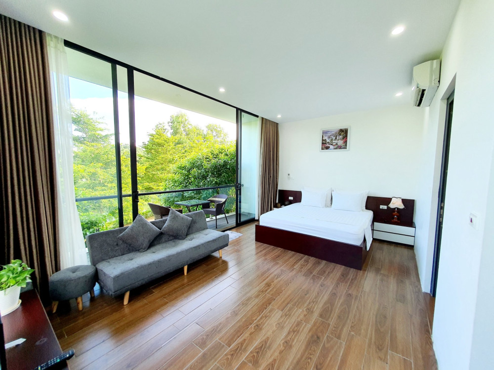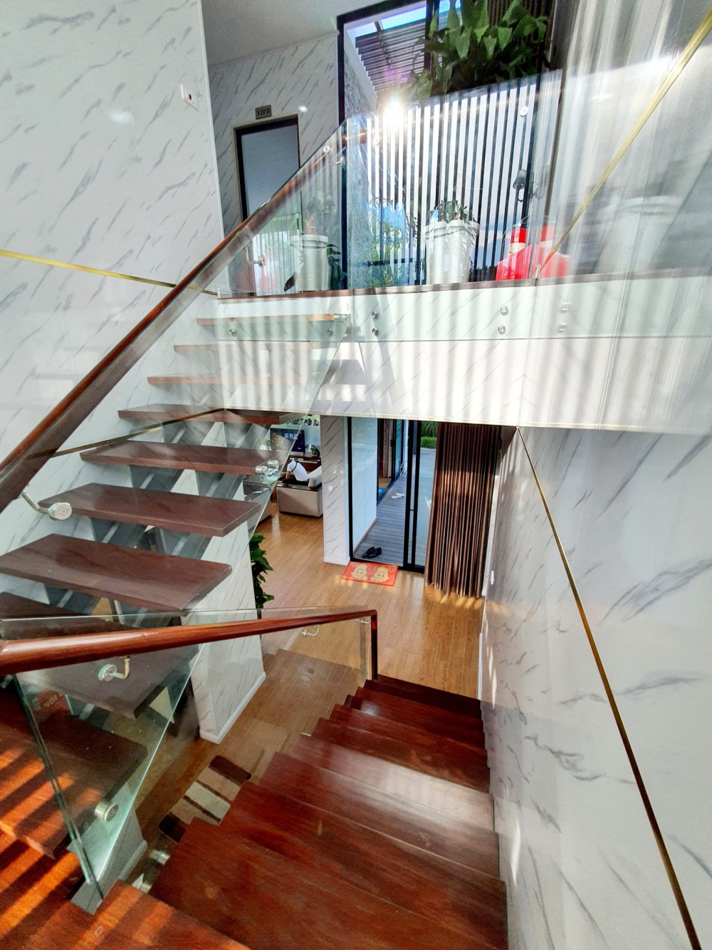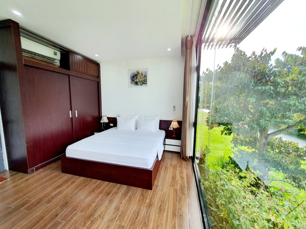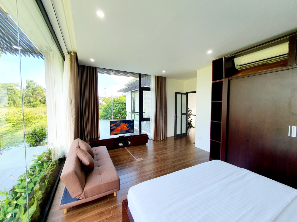 Biệt thự thiết kế theo phong cách mở, sử dụng tông màu trắng – nâu gỗ hiện đại, tạo cảm giác sang trọng mà vẫn gần gũi với thiên nhiên. Ban công tầng 2 có view nhìn thẳng ra khu rừng thông và hồ nước – nơi lý tưởng để ngắm bình minh hoặc thưởng thức cà phê sáng.