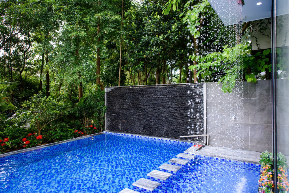 • Hồ bơi riêng 60 m² với hệ thống tạo sóng ngược dòng và thác nước tự nhiên