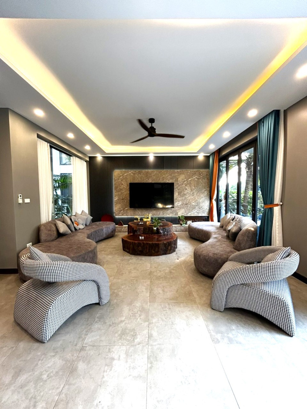 - Villa nằm trên khuôn viên rộng, 3 tầng + tầng hầm, tầng hầm được thiết kế như khu giải trí riêng biệt với phòng karaoke, bàn bi-a, hầm rượu.