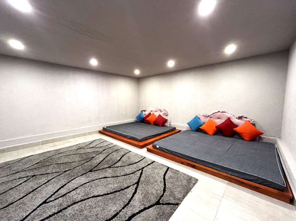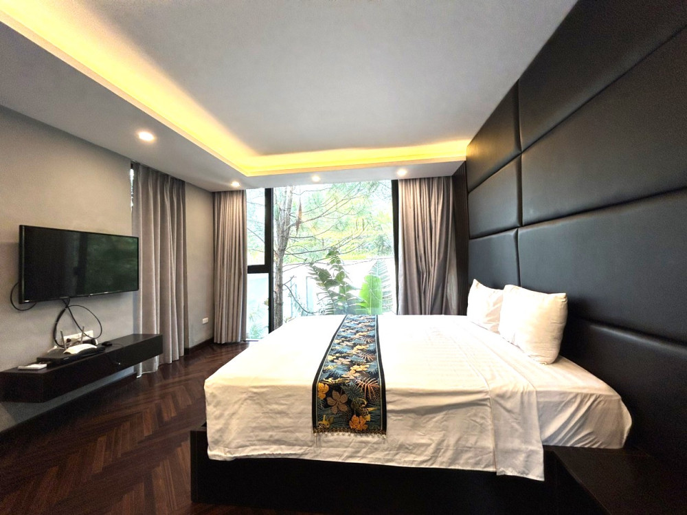 - Tầng 1 gồm phòng khách lớn, bếp + bàn ăn đồ sộ đủ cho cả đoàn. Tầng 2-3 gồm 6 phòng ngủ khép kín (5 phòng giường King size + 1 phòng giường Double) với khả năng kê thêm đệm phụ.