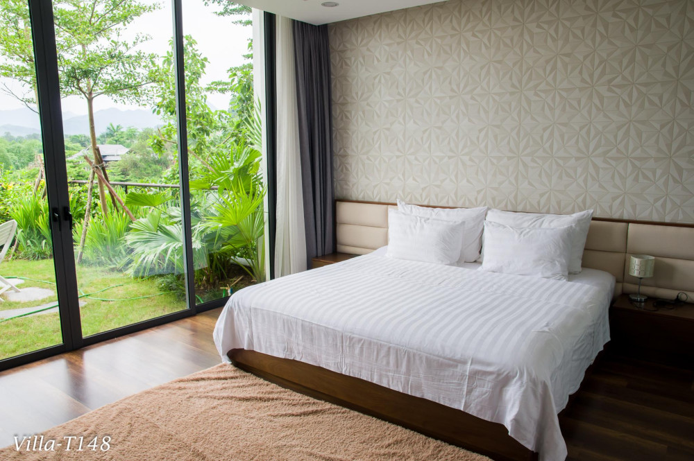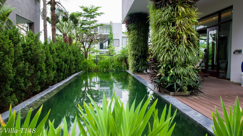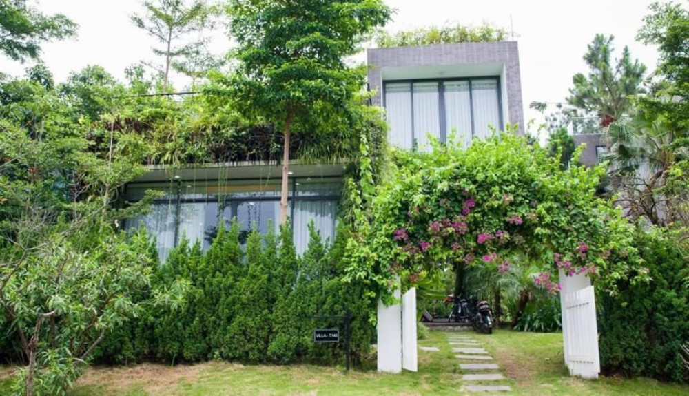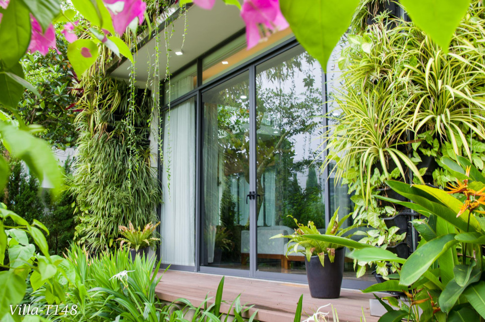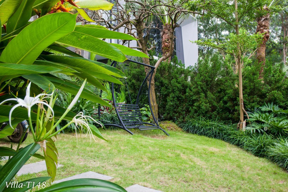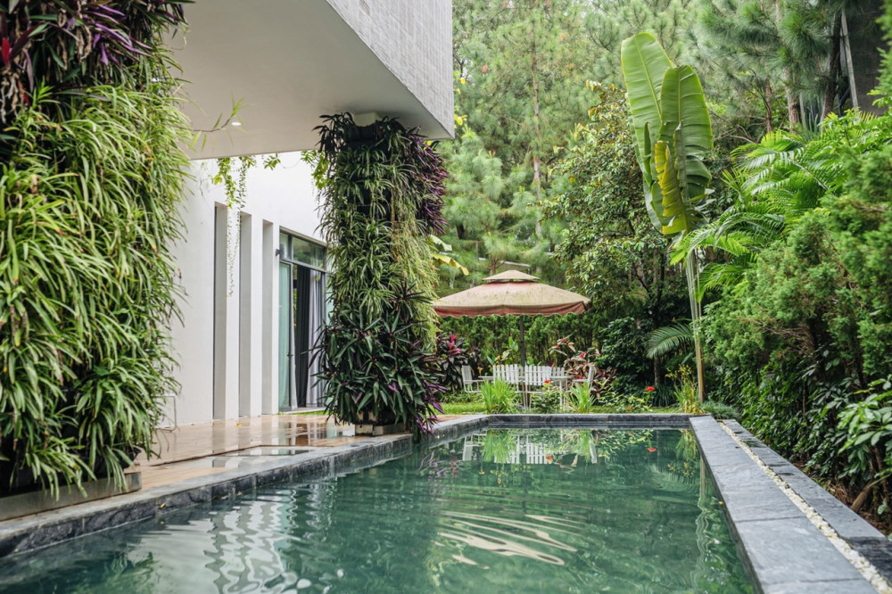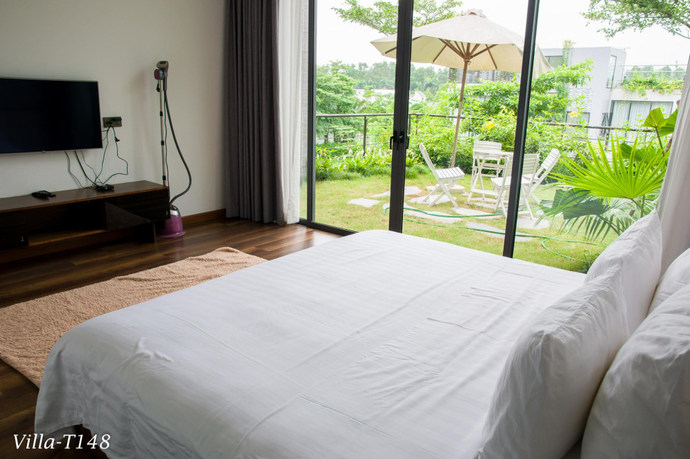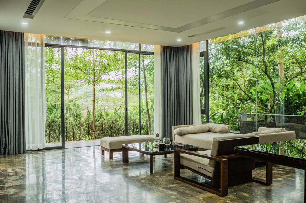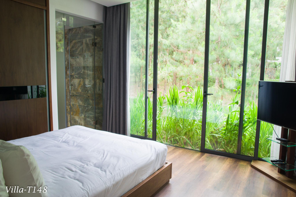 Mỗi phòng ngủ đều có view hướng ra rừng xanh hoặc hồ bơi, cửa kính lớn để đón sáng tự nhiên. Sân vườn rộng rãi và hồ bơi riêng sẽ là điểm nhấn để chủ villa có thể thêm thác nước, đèn trang trí hoặc góc chụp ảnh đẹp.
