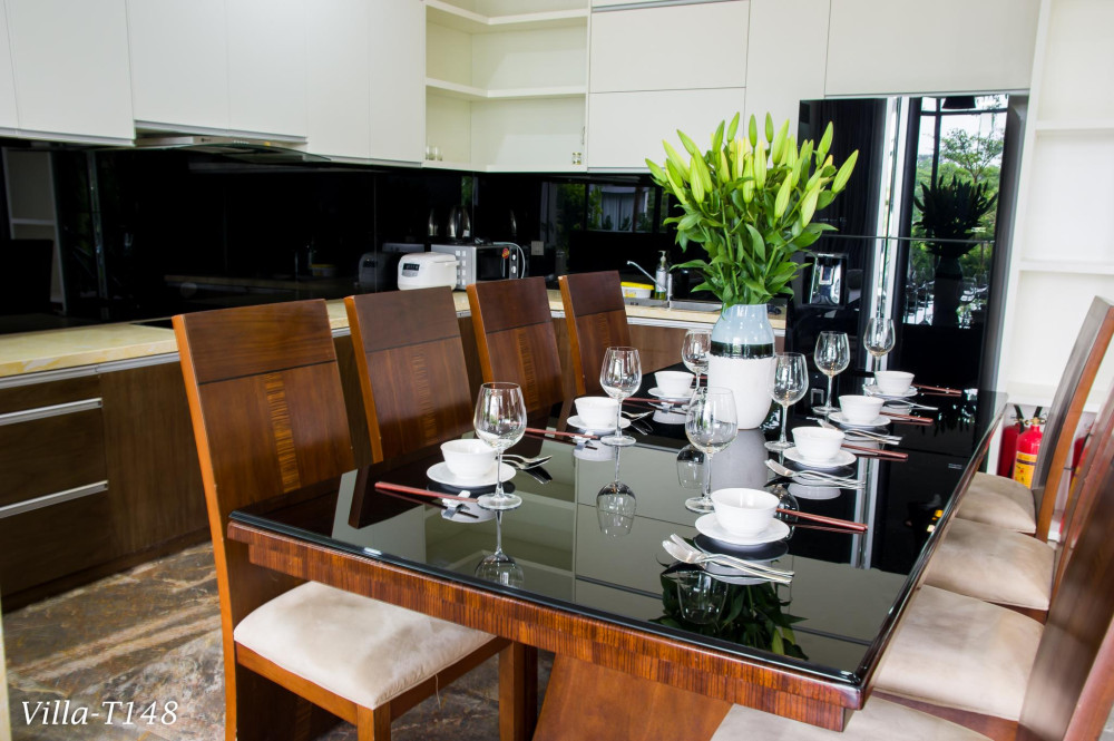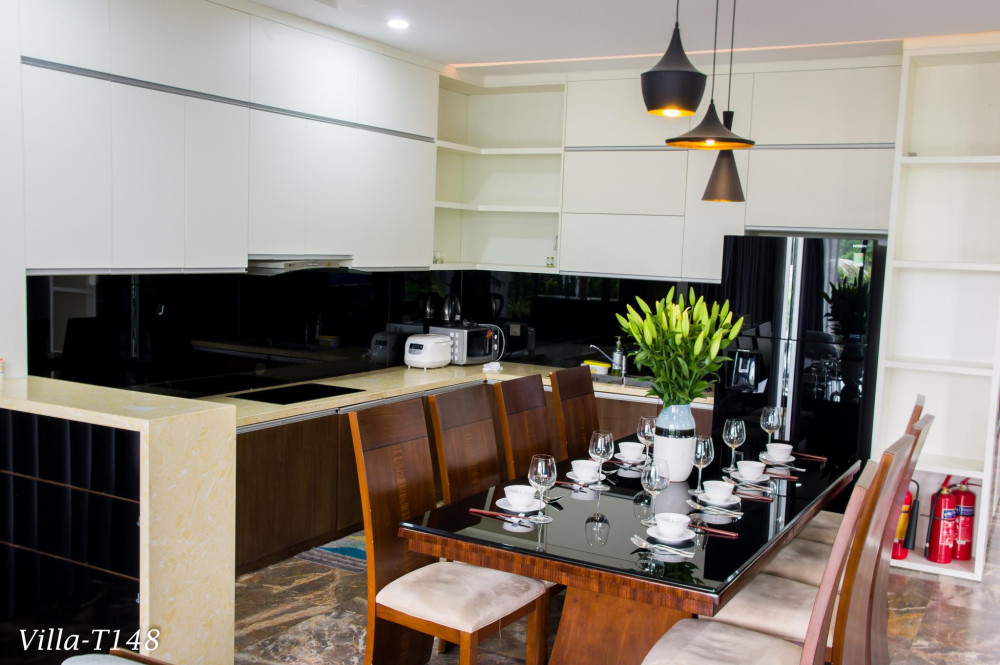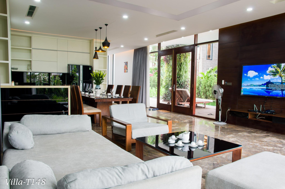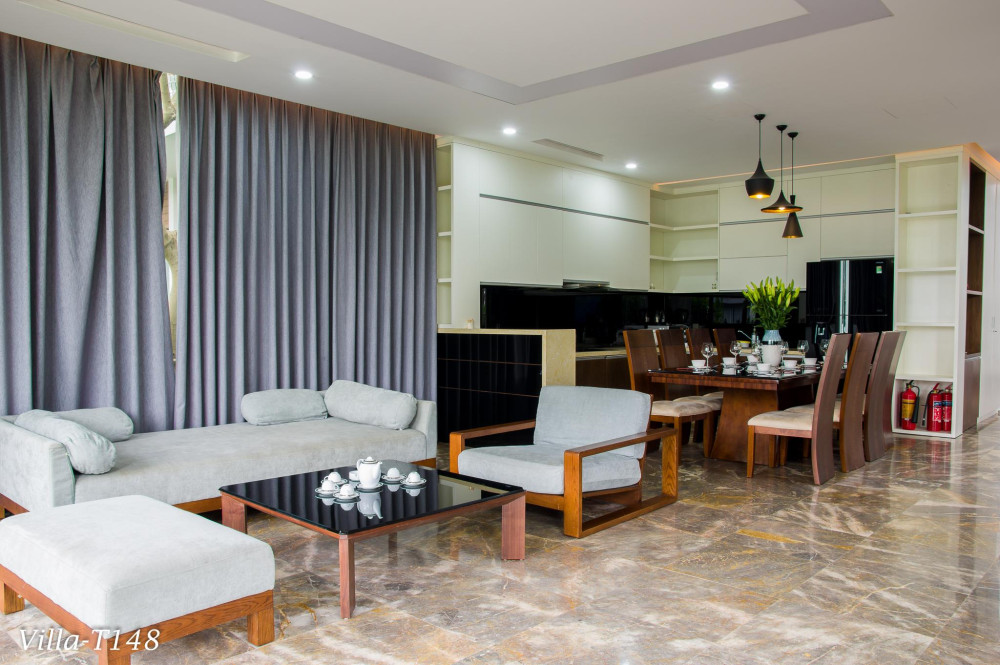 Villa T148 được thiết kế theo phong cách sang trọng pha nét hiện đại tối giản. Không gian mở giữa phòng khách, khu bếp và hiên ngoài giúp mọi thành viên dễ dàng kết nối khi nghỉ dưỡng.