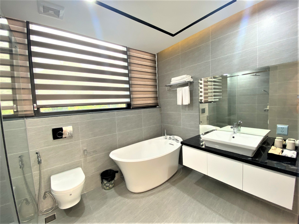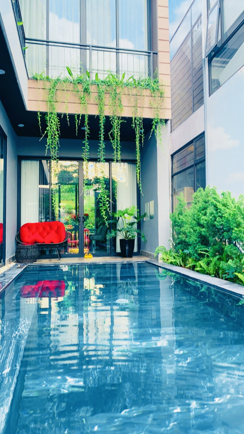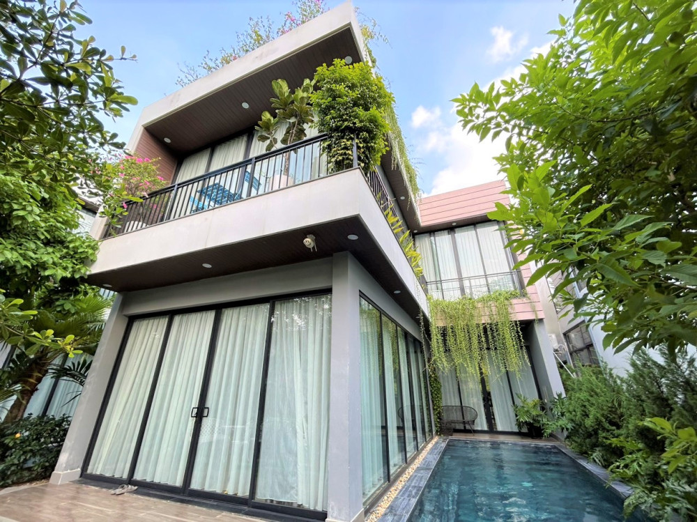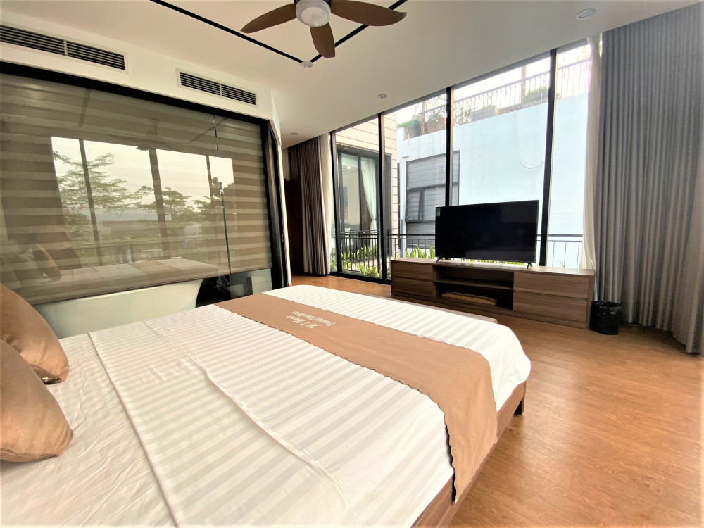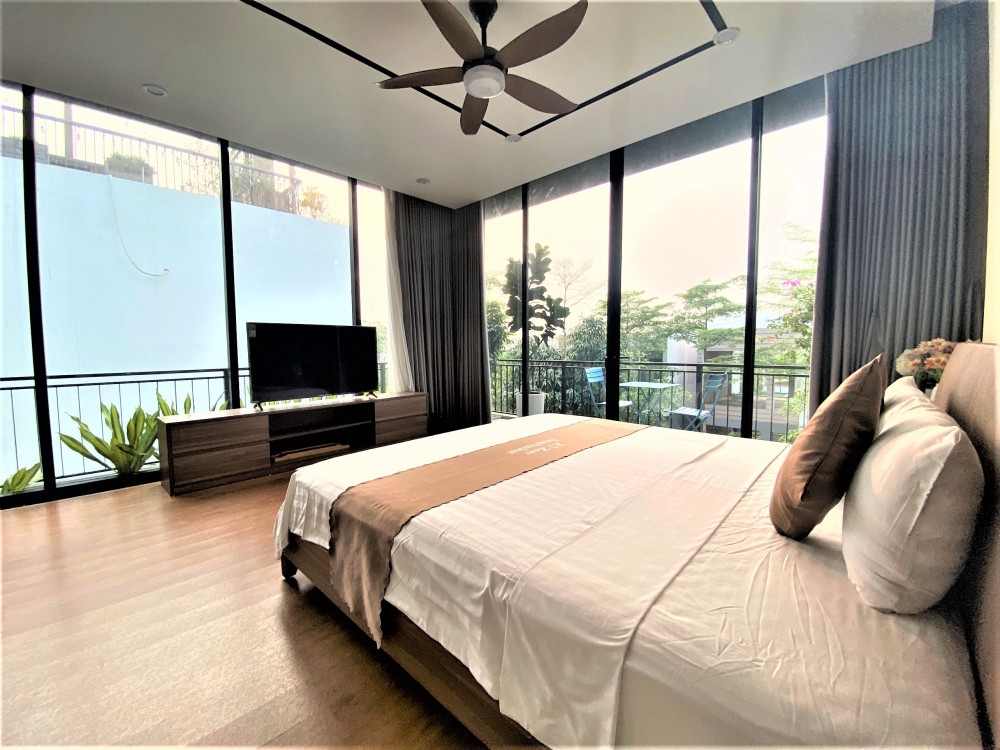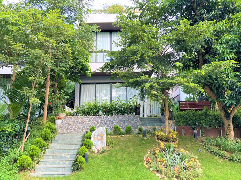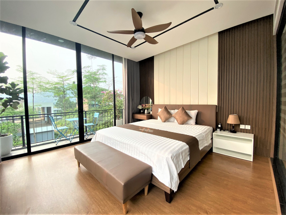Ba phòng ngủ khép kín được bố trí hợp lý để mỗi nhóm nhỏ hoặc gia đình nhỏ đều có không gian riêng tư thoải mái. Khu hồ bơi liền kề sân vườn cây thông giúp buổi chiều hoàng hôn trở nên lãng mạn, buổi sáng khai màn bằng xe đạp quanh hồ.