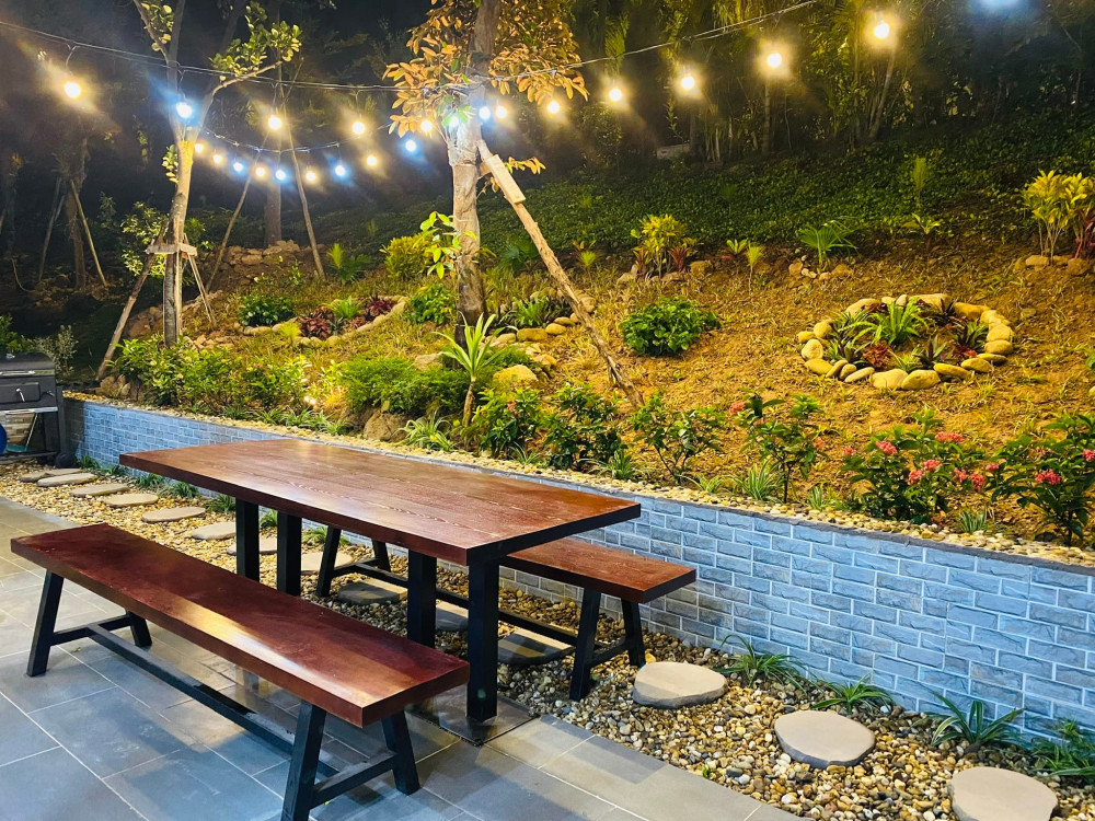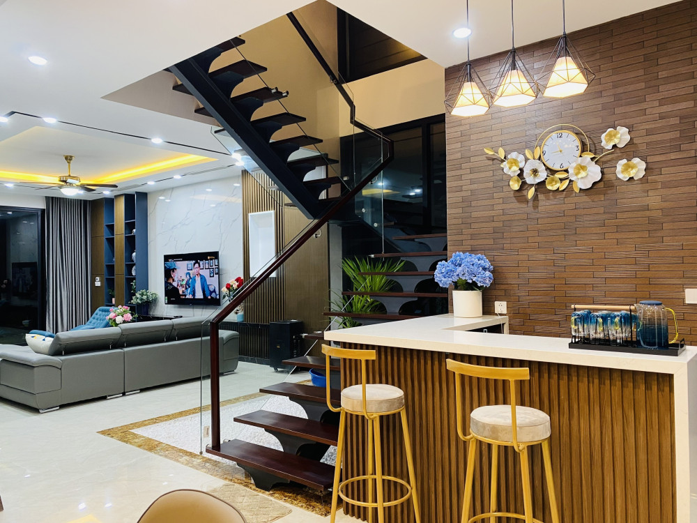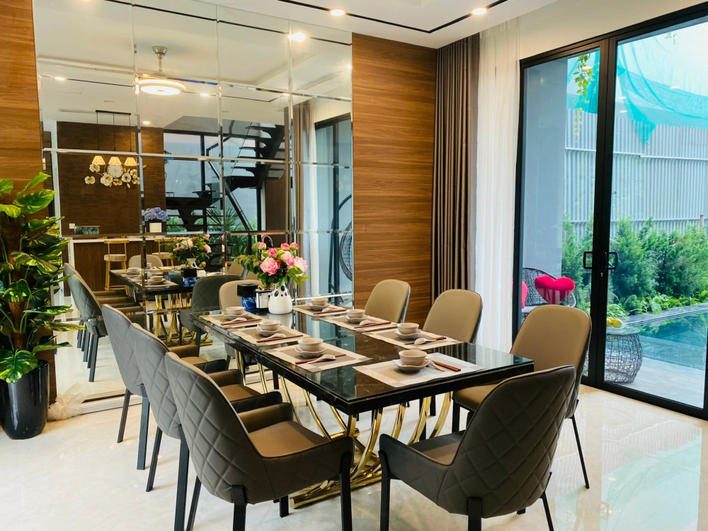 Tầng trệt là không gian sinh hoạt chung với phòng khách rộng, bếp ăn đầy đủ tiện nghi, mở ra sân ngoài với bàn ăn và khu vực BBQ ngoài trời.