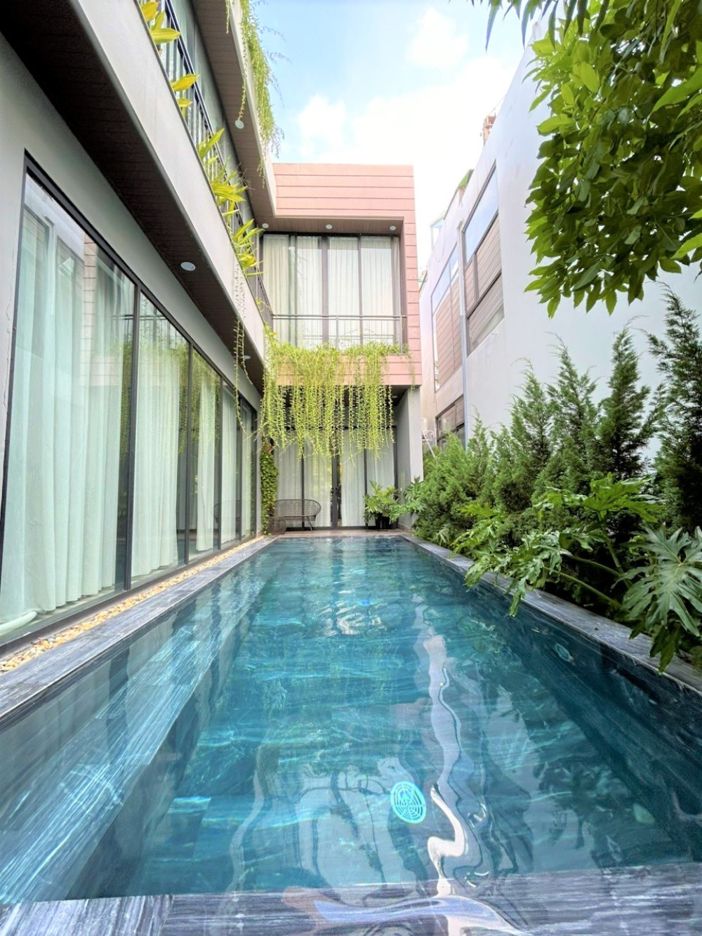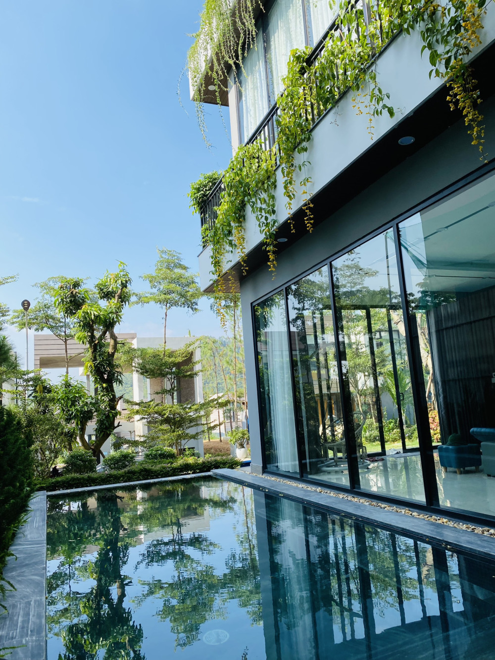 Villa E3.12A được thiết kế theo phong cách nghỉ dưỡng hiện đại với tông màu trung tính, nổi bật là cửa kính lớn hướng ra sân vườn và hồ bơi tạo cảm giác mở, kết nối thiên nhiên.