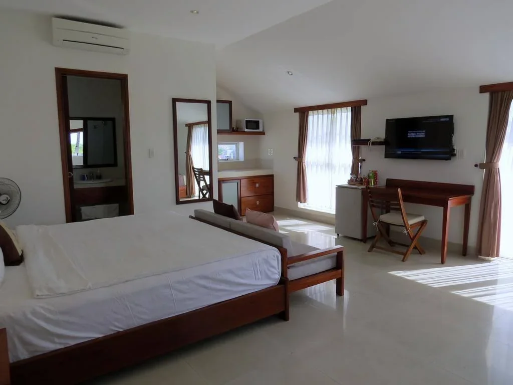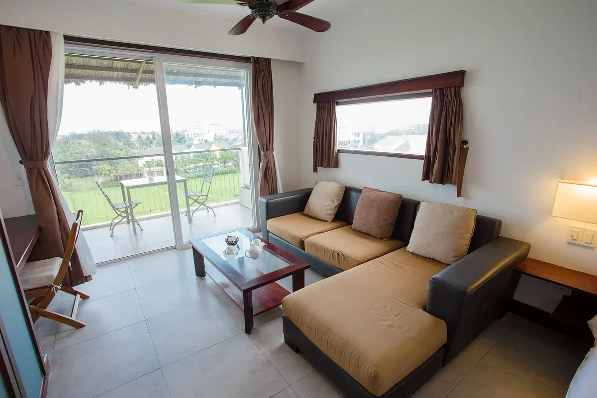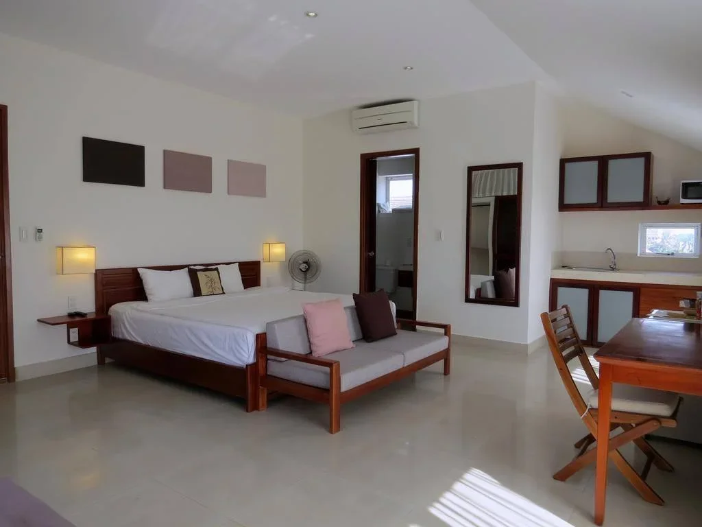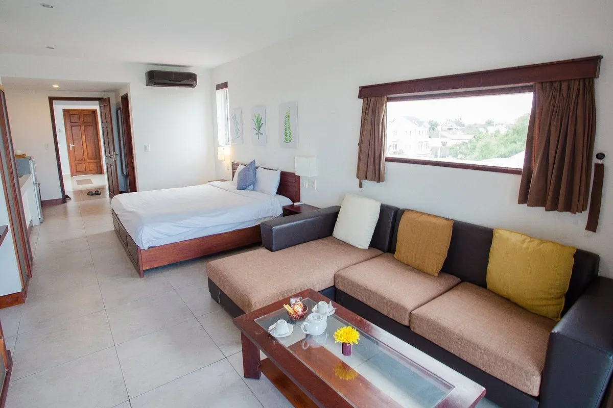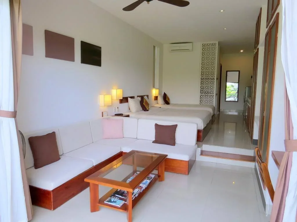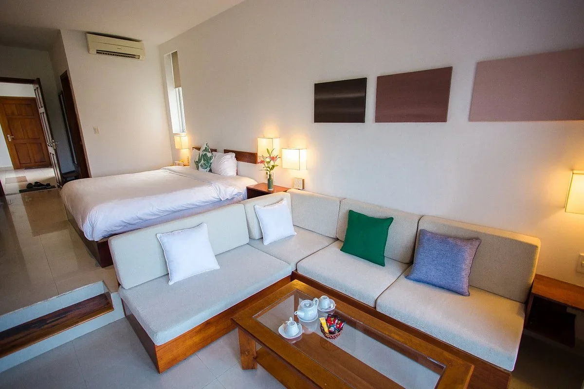 Phòng rộng 45–50 m², trang bị ghế sofa, TV 32 inch, giường nệm cao cấp và nhà tắm riêng.