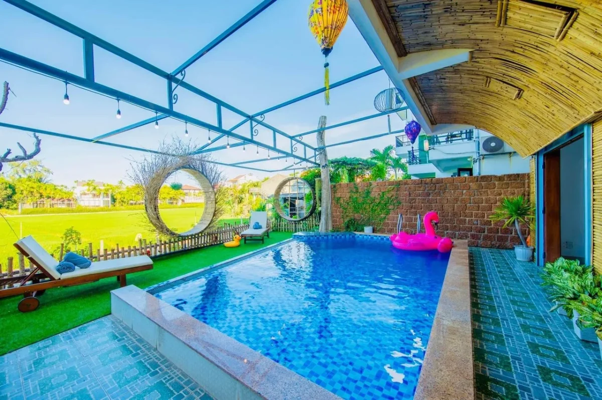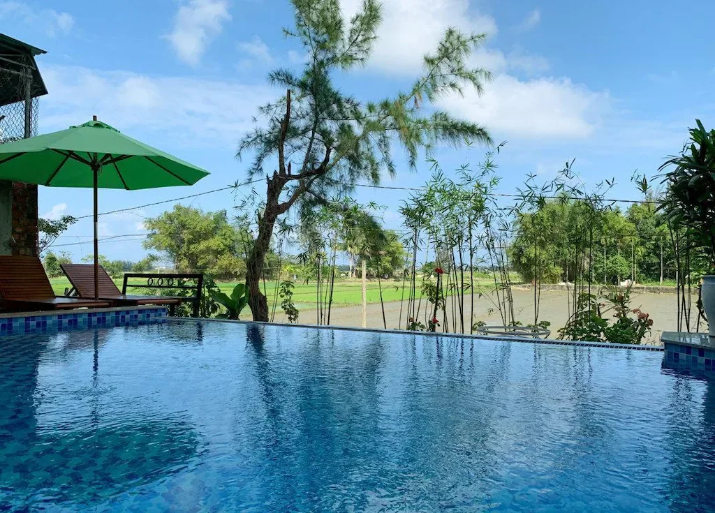 Hồ bơi của villa có view mở nhìn ra cánh đồng lúa, tạo nên khung cảnh thư giãn tuyệt vời, đặc biệt vào lúc bình minh hoặc hoàng hôn.