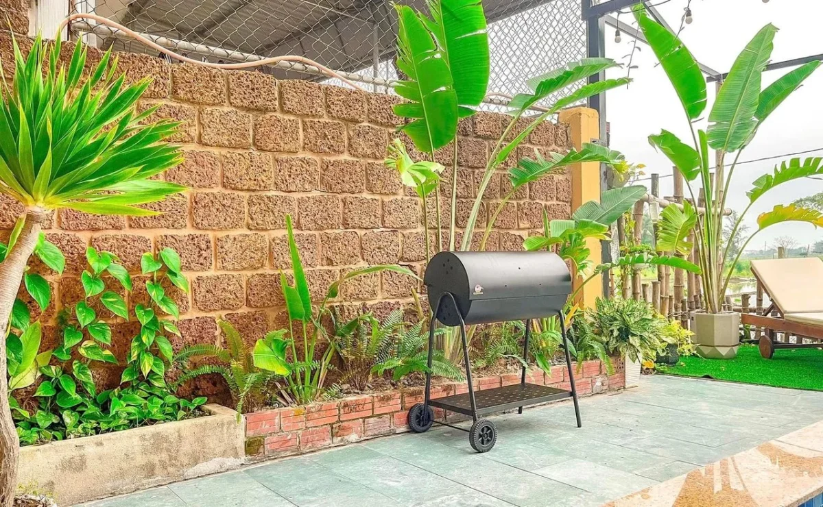 Green Life Villa có bếp nấu và khu BBQ ngoài trời được setup đầy đủ – từ dụng cụ nấu nướng, lò nướng đến bàn ghế ngoài sân.