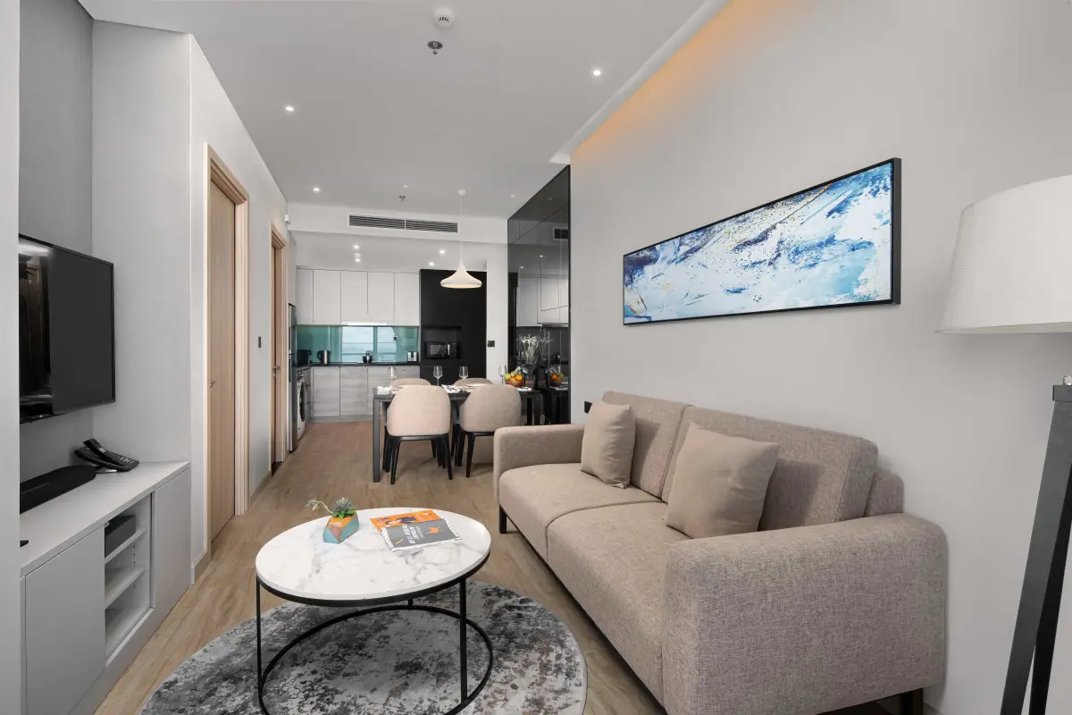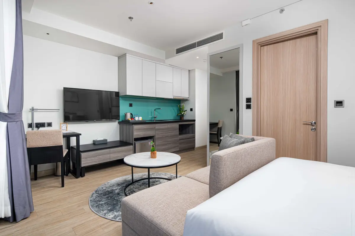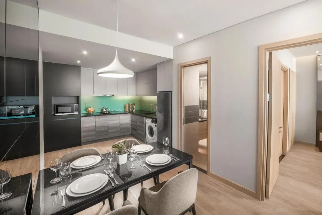 Căn hộ Studio & Căn hộ nhiều phòng ngủ: Được trang bị đầy đủ khu vực bếp, tủ lạnh lớn và bàn ăn. Đây là giải pháp hoàn hảo cho các gia đình muốn tận hưởng cảm giác "như ở nhà" nhưng vẫn có đầy đủ dịch vụ 5 sao.