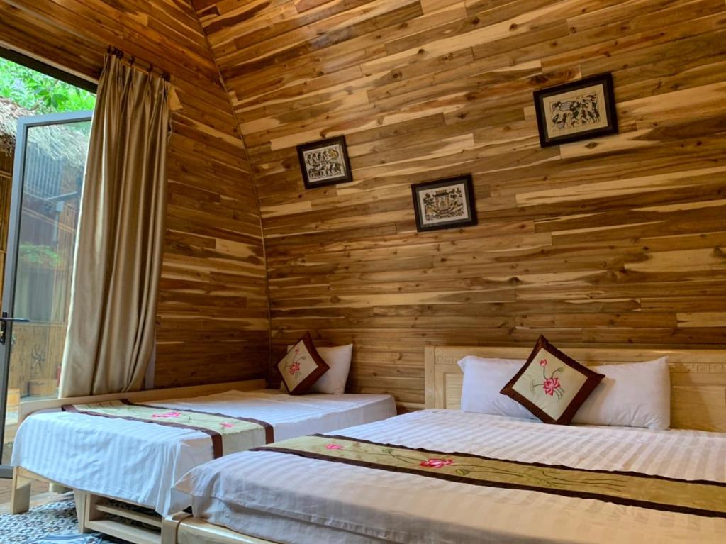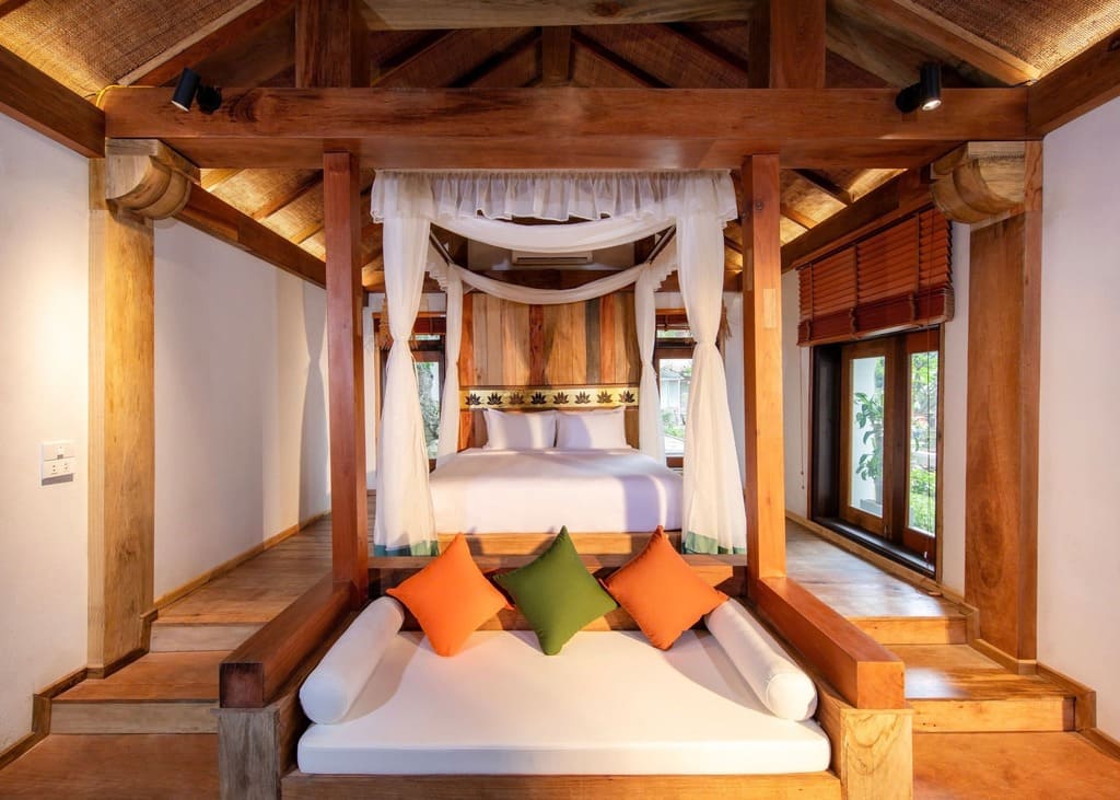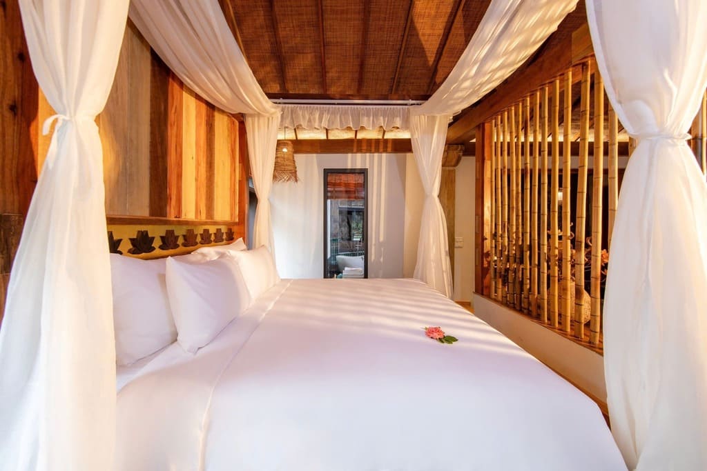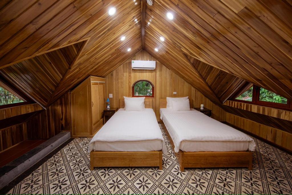 Resort này được xây dựng với sự kết hợp hài hòa giữa phong cách kiến trúc truyền thống và hiện đại, mang lại cho du khách sự gần gũi với thiên nhiên nhưng vẫn đảm bảo đầy đủ tiện nghi. Các phòng nghỉ tại Hang Múa Ecolodge được chia thành nhiều loại, bao gồm Deluxe Bungalow và các biệt thự rộng lớn với 4 phòng ngủ, phù hợp cho các nhóm gia đình hoặc bạn bè đi nghỉ dưỡng cùng nhau. Từ các căn bungalow, du khách có thể chiêm ngưỡng cảnh quan núi non hoặc hồ bơi xanh mát, tạo nên một không gian thư giãn tuyệt vời.
