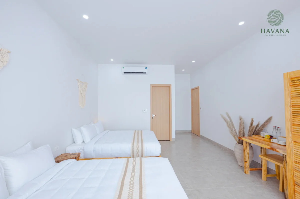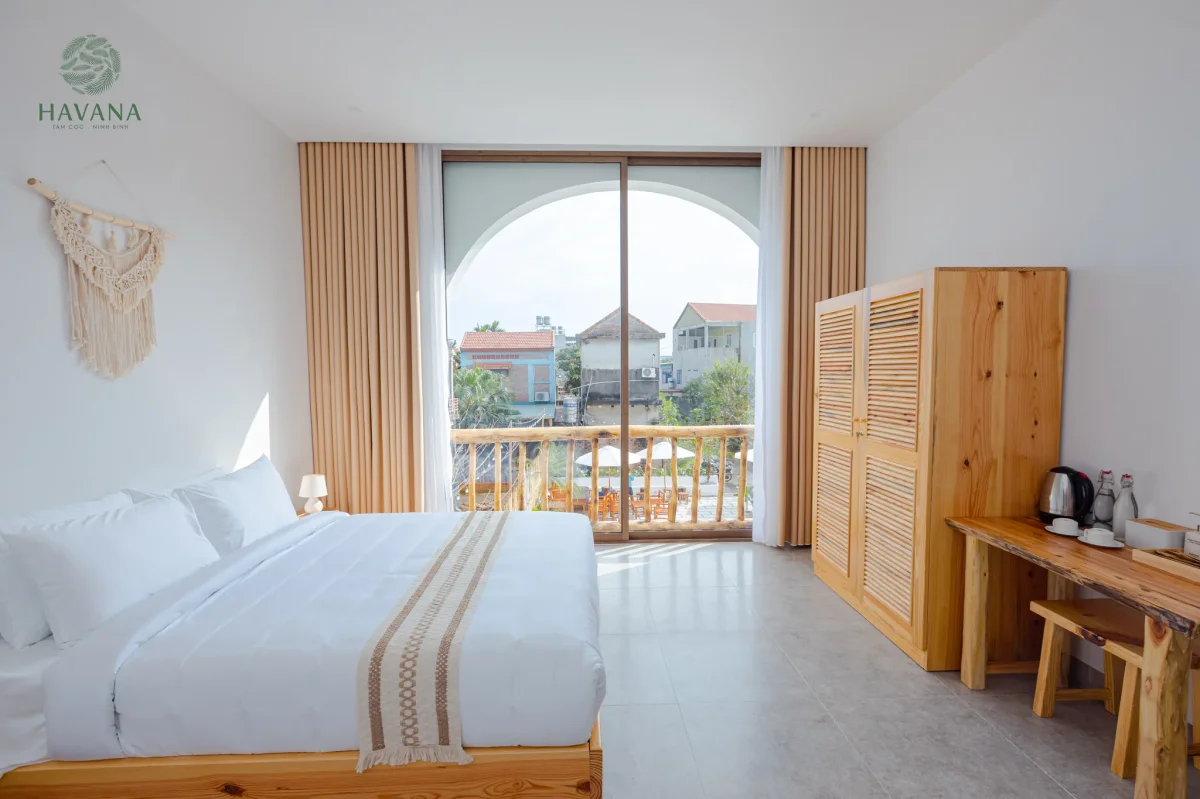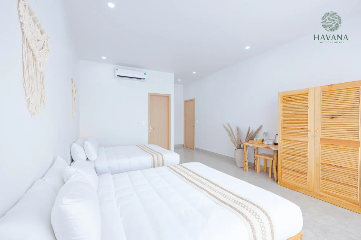 Hệ thống phòng nghỉ tại HAVANA Tam Cốc được trang bị đầy đủ tiện nghi, đáp ứng nhu cầu của cả khách đi một mình, cặp đôi hoặc gia đình. Phòng Deluxe và Villa là hai loại phòng phổ biến nhất, với không gian rộng rãi, ban công hoặc sân hiên riêng biệt. Từ đây, bạn có thể ngắm nhìn khu vườn xanh mát hoặc hồ bơi ngoài trời. Nội thất trong phòng được bố trí tinh tế với giường ngủ êm ái, điều hòa không khí, TV màn hình phẳng và phòng tắm riêng hiện đại. Dù là kỳ nghỉ ngắn ngày hay dài ngày, bạn cũng sẽ cảm nhận được sự thoải mái và tiện nghi khi lưu trú tại đây.