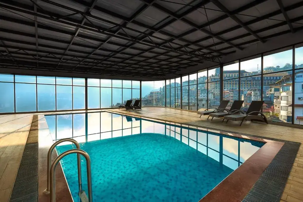 một trong những điểm nổi bật của amazing hotel sapa chính là bể bơi trong nhà với tầm nhìn ra núi, mang đến trải nghiệm thư giãn độc đáo giữa khung cảnh thiên nhiên. du khách có thể thả mình trong làn nước mát và ngắm nhìn thung lũng bao la phía xa. ngoài ra, khách sạn còn có khu vực spa, nơi cung cấp các liệu pháp thư giãn kết hợp giữa phương pháp đông phương và các thảo dược địa phương, giúp du khách phục hồi năng lượng sau những chuyến đi bộ khám phá sapa.