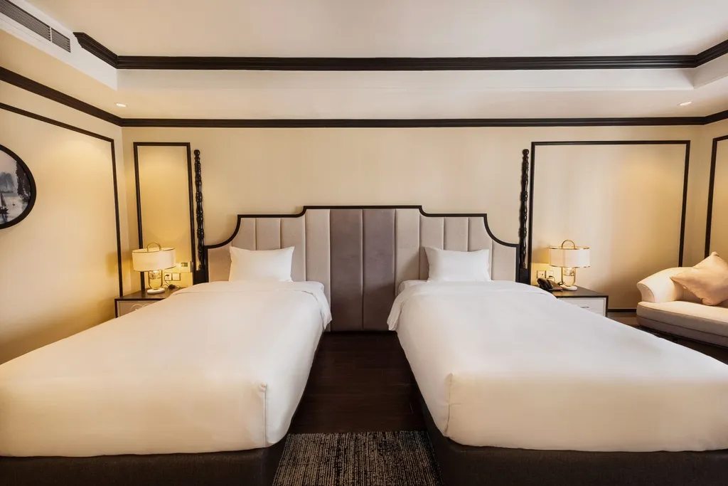 - Tầm nhìn "triệu đô": Hầu hết các phòng nghỉ đều sở hữu hệ thống cửa kính lớn, giúp du khách thu trọn vào tầm mắt vẻ đẹp hùng vĩ của Vịnh Hạ Long hoặc sự lung linh, nhộn nhịp của thành phố biển về đêm.