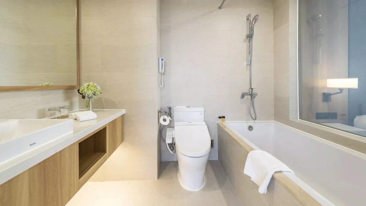 - Phòng tắm hiện đại với vòi sen, bồn tắm và đồ dùng vệ sinh cá nhân cao cấp.