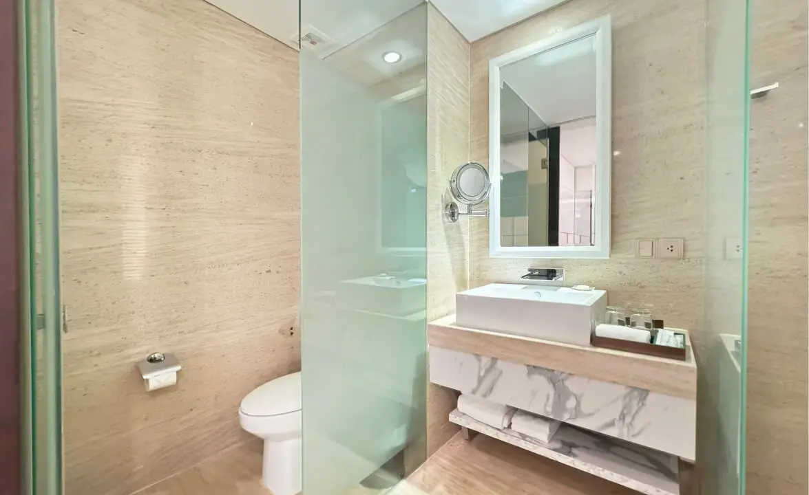 - Phòng tắm riêng có bồn tắm hoặc vòi sen, đồ vệ sinh cá nhân, dép đi trong phòng và áo choàng tắm mềm mại