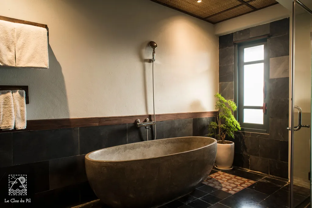 Le Clos Du Fil nổi bật với kiến trúc mang đậm nét truyền thống Việt Nam, sử dụng vật liệu địa phương và trang trí bằng các sản phẩm thêu tay tinh xảo.