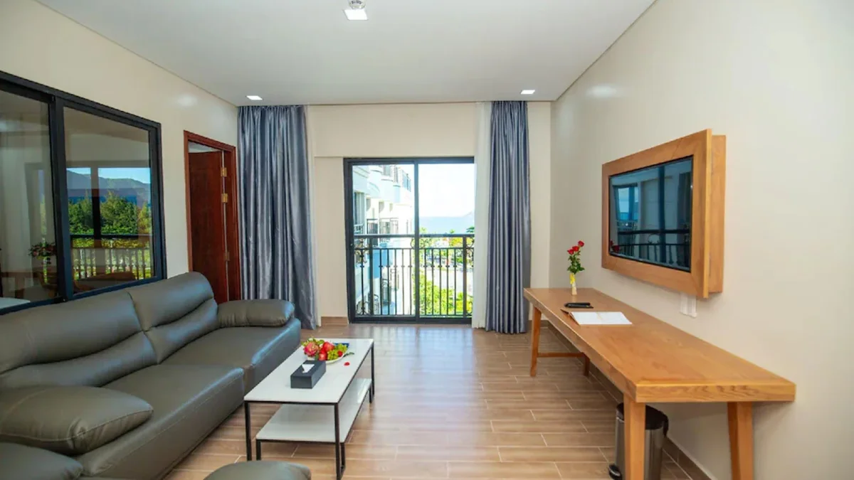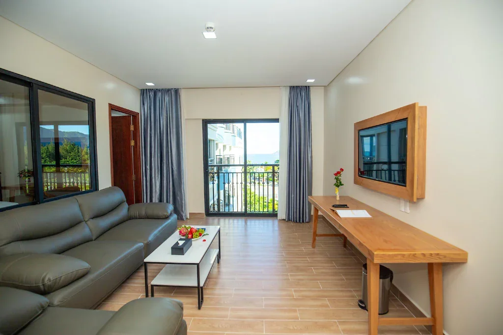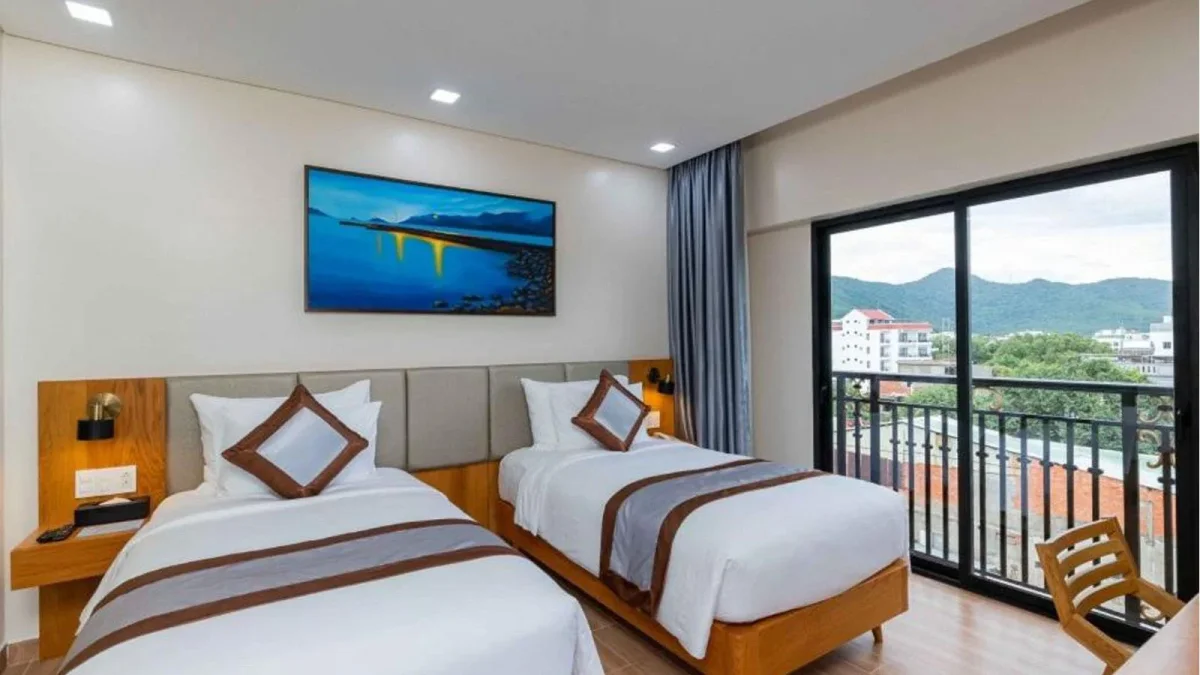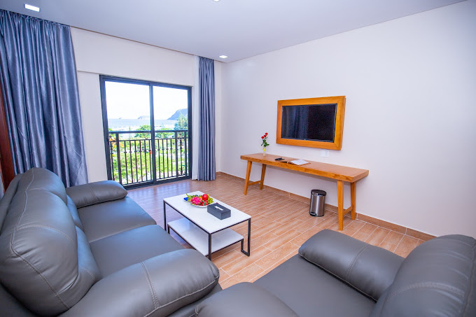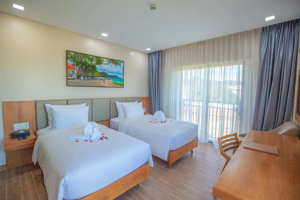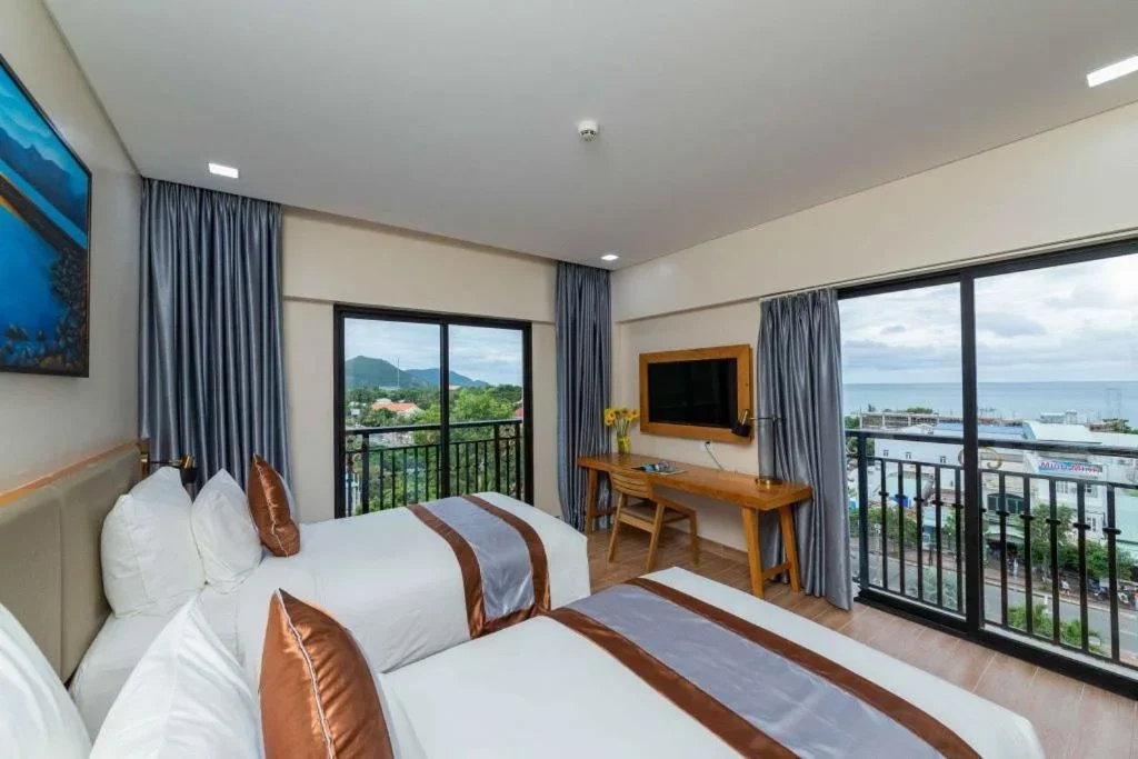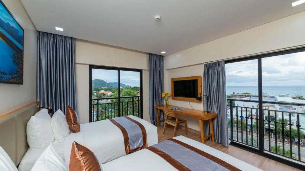 Đặc biệt, khách sạn chỉ cách sân bay Cỏ Ống khoảng 15 phút di chuyển, và từ đây bạn có thể dễ dàng bắt taxi hoặc thuê xe để khám phá bãi Đầm Trầu, miếu Bà Phi Yến, hay mũi Tàu Bể những điểm du lịch nổi bật nhất đảo.