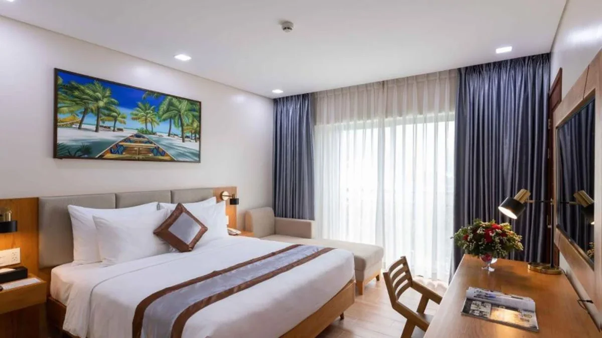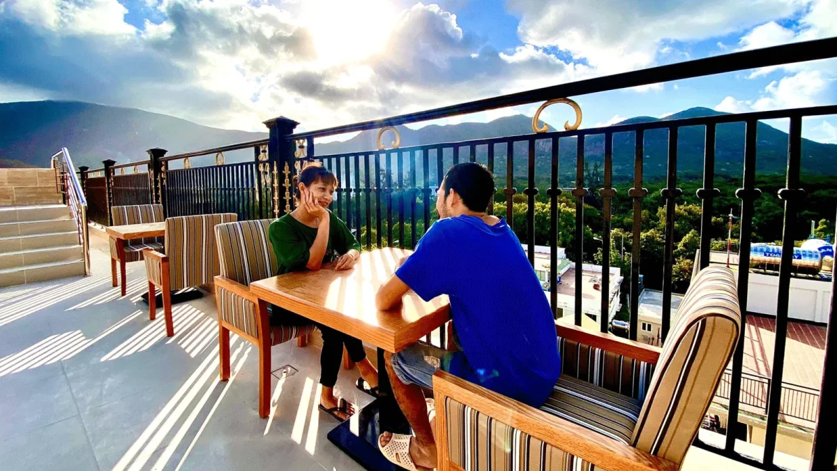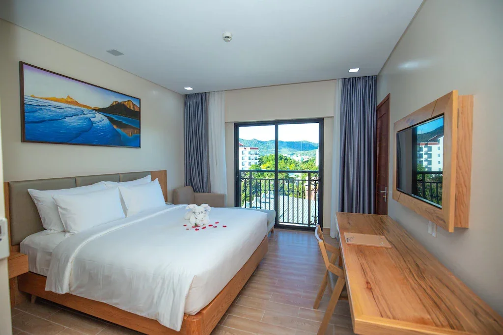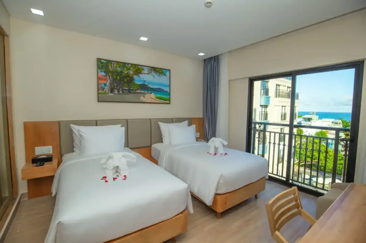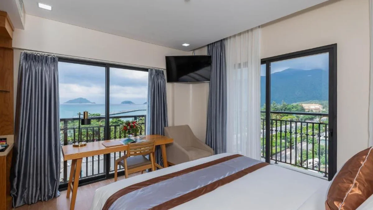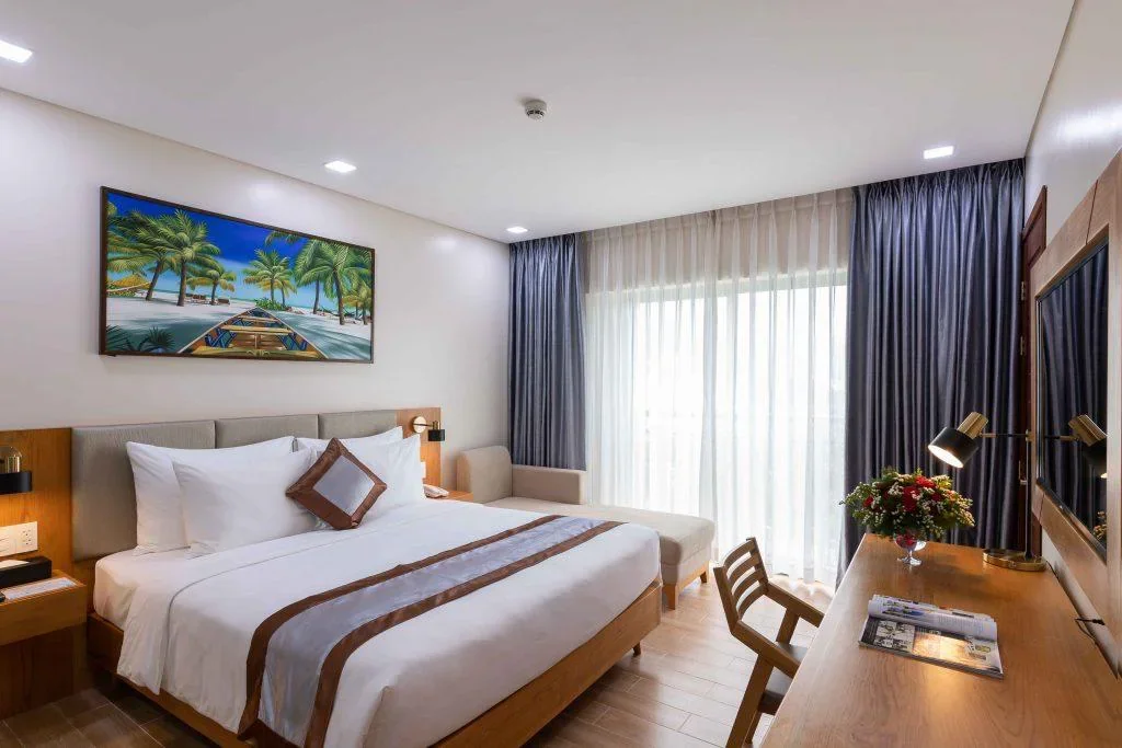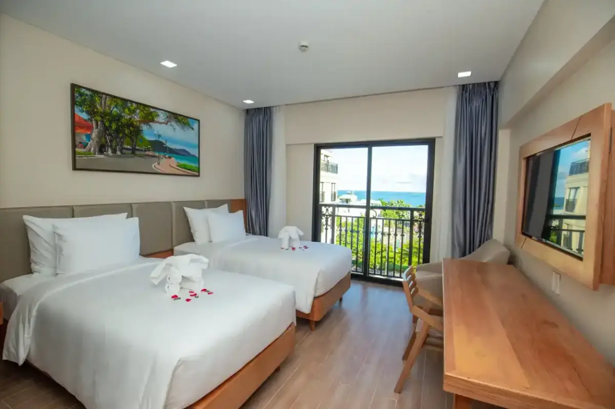 Đặc biệt, khách sạn chỉ cách sân bay Cỏ Ống khoảng 15 phút di chuyển, và từ đây bạn có thể dễ dàng bắt taxi hoặc thuê xe để khám phá bãi Đầm Trầu, miếu Bà Phi Yến, hay mũi Tàu Bể những điểm du lịch nổi bật nhất đảo.