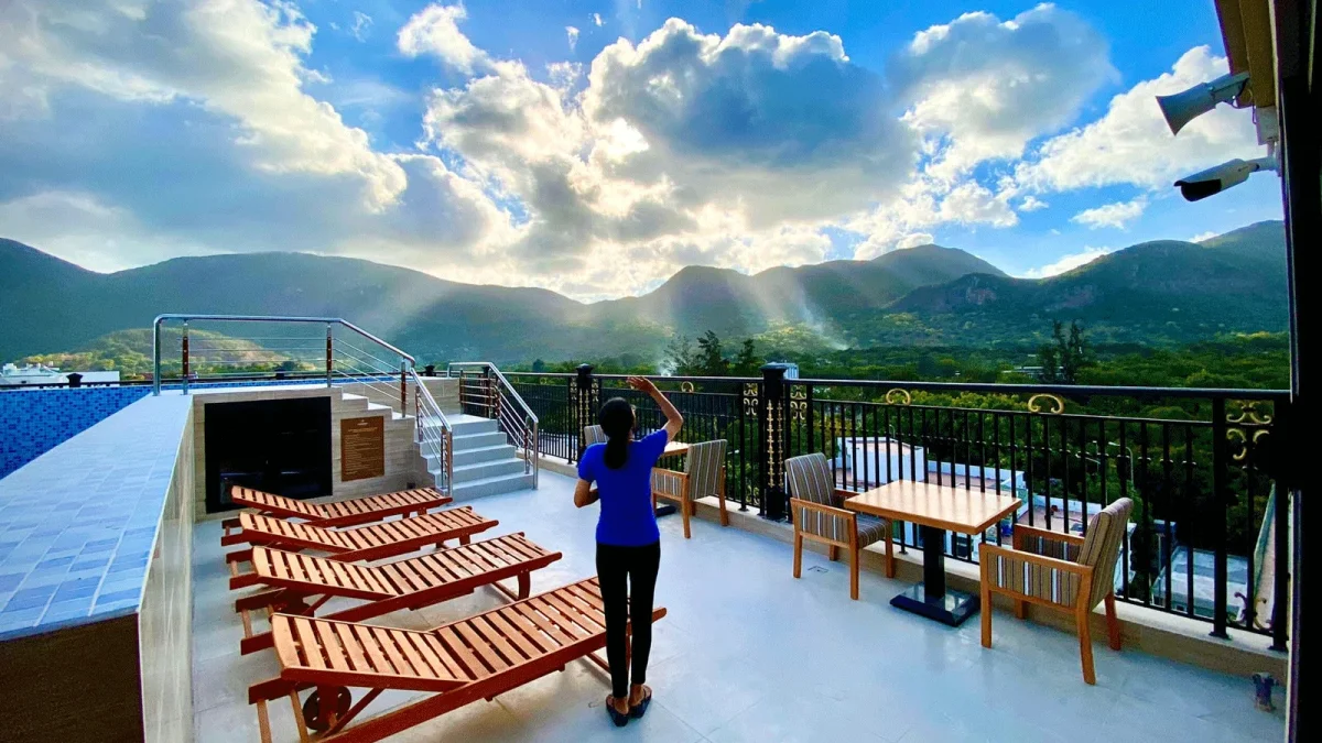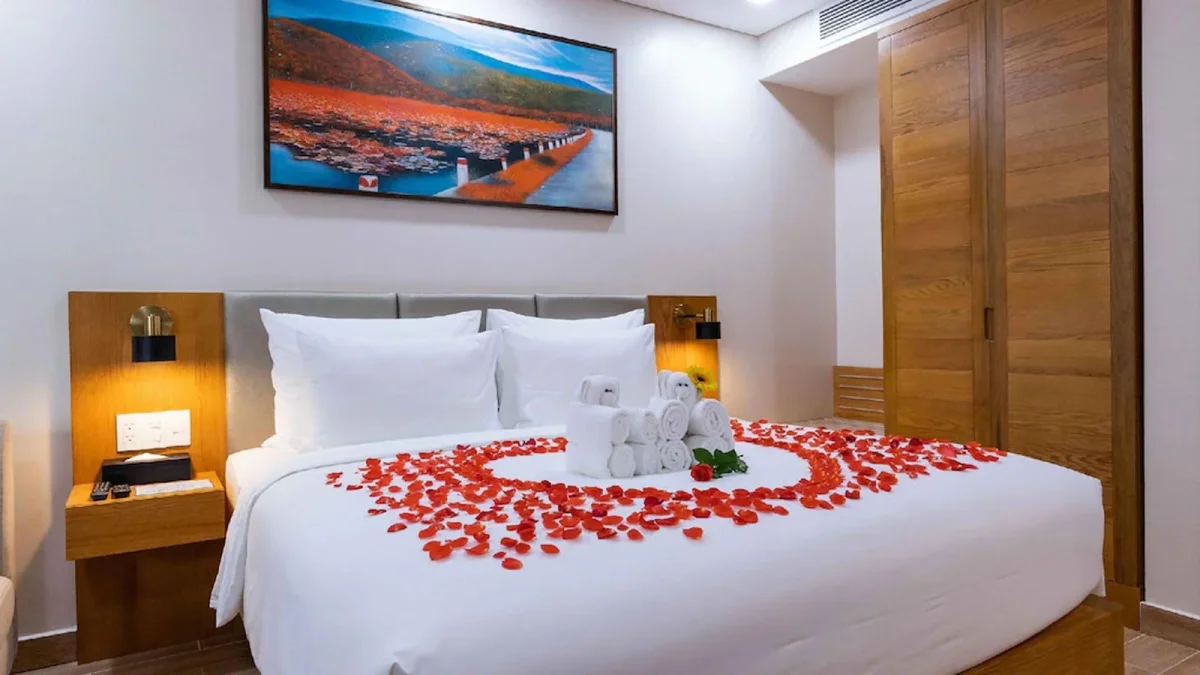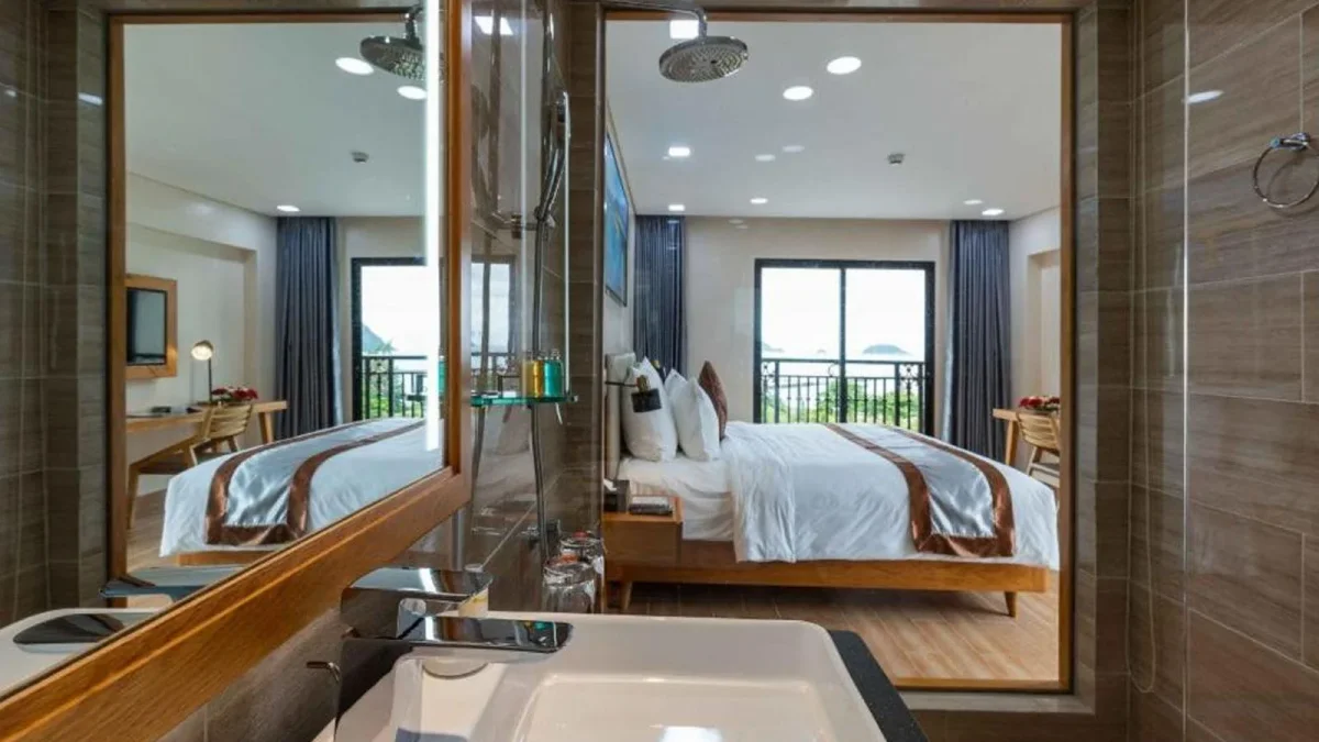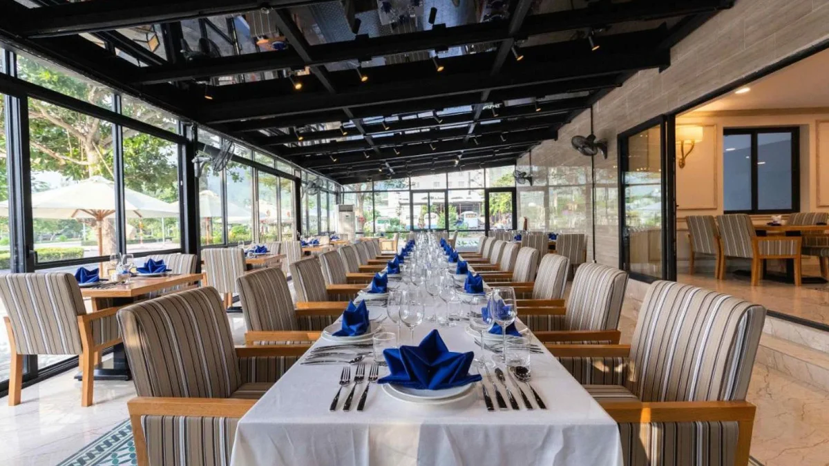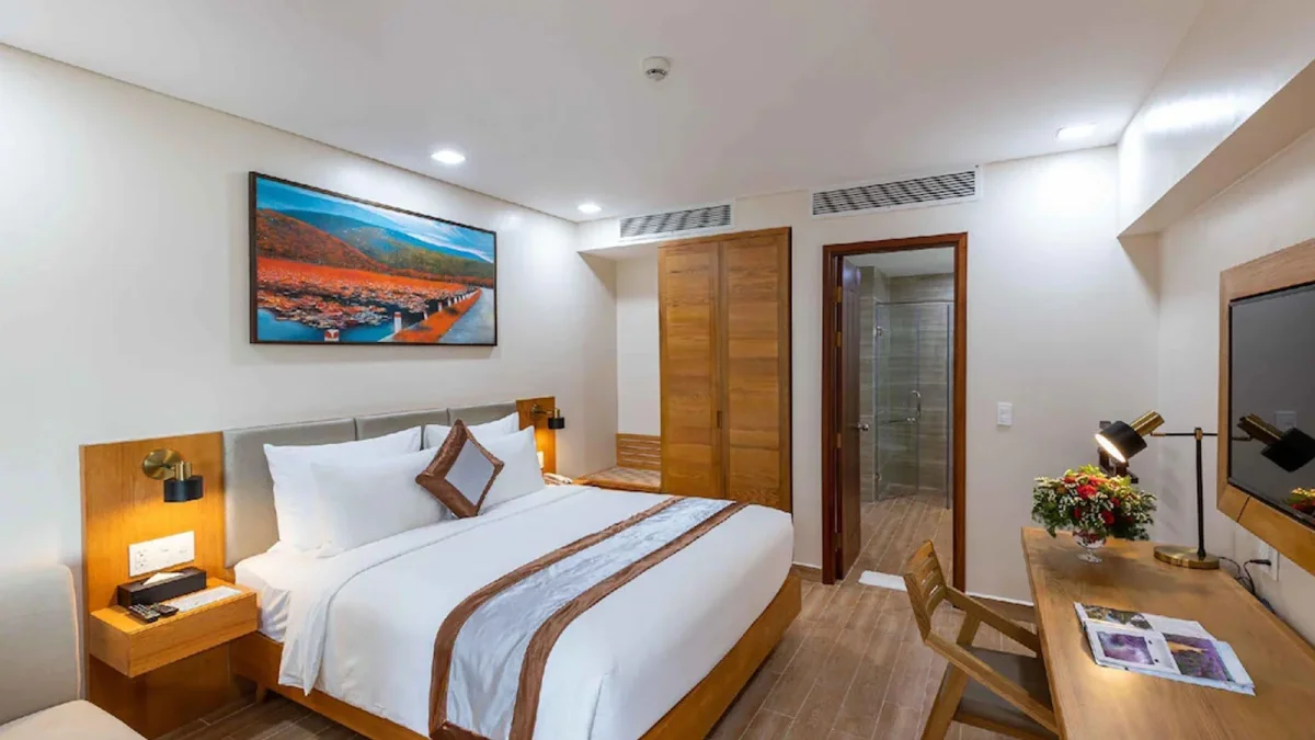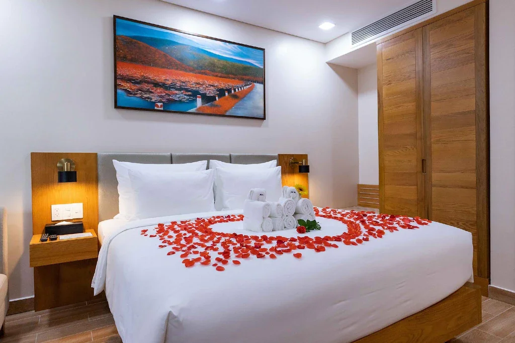 Đặc biệt, khách sạn chỉ cách sân bay Cỏ Ống khoảng 15 phút di chuyển, và từ đây bạn có thể dễ dàng bắt taxi hoặc thuê xe để khám phá bãi Đầm Trầu, miếu Bà Phi Yến, hay mũi Tàu Bể những điểm du lịch nổi bật nhất đảo.