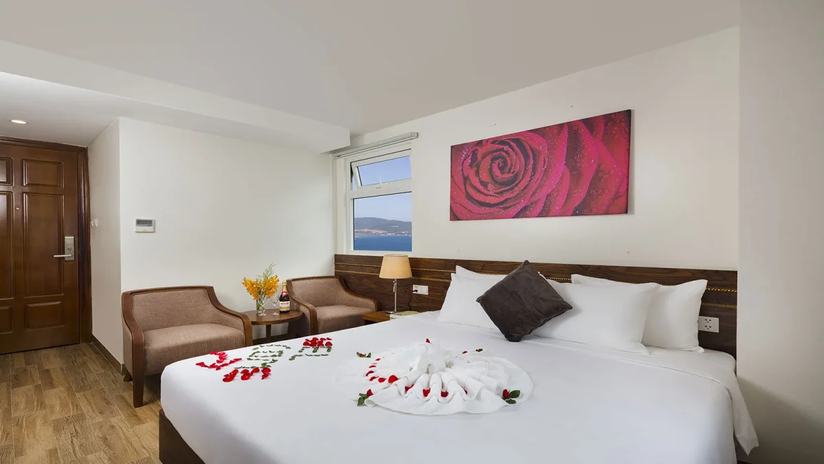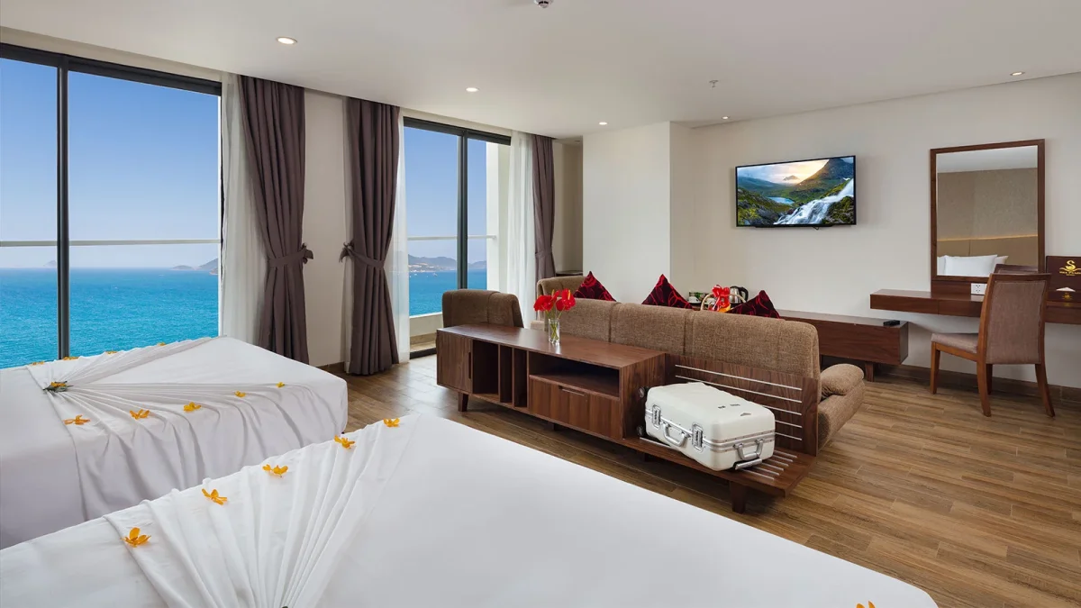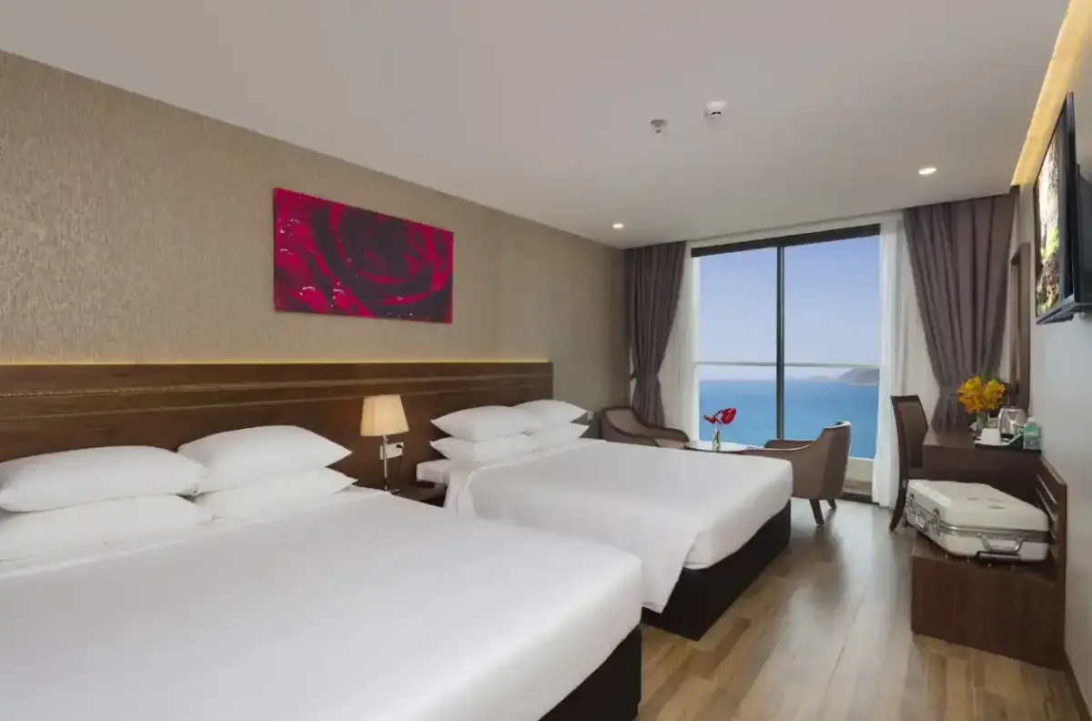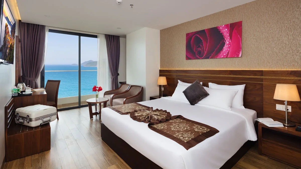 - Tầm nhìn ấn tượng: Khách sạn có các phòng với tầm nhìn hướng phố và đặc biệt là các hạng phòng cao cấp có view biển trực diện (Ocean View), cho phép bạn ngắm trọn vẹn vẻ đẹp của vịnh Nha Trang ngay từ ban công phòng.