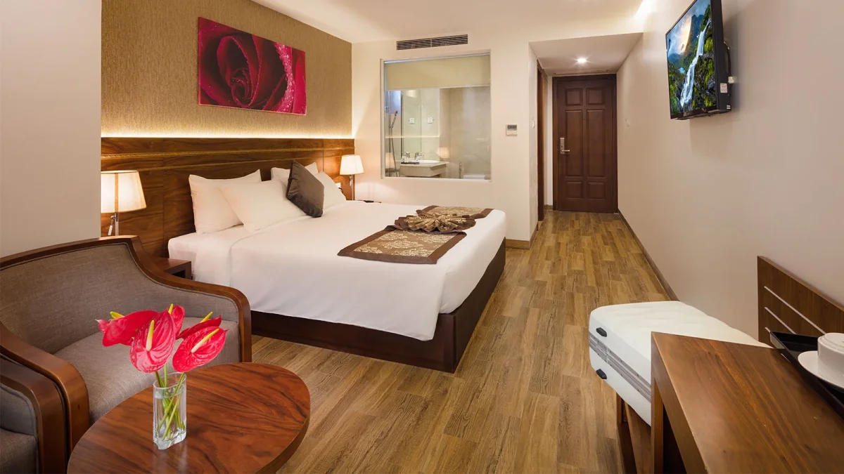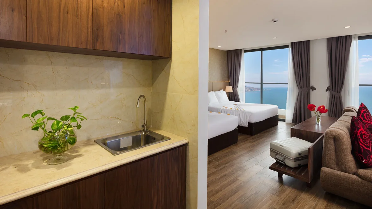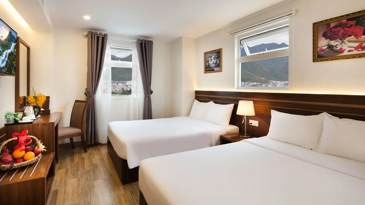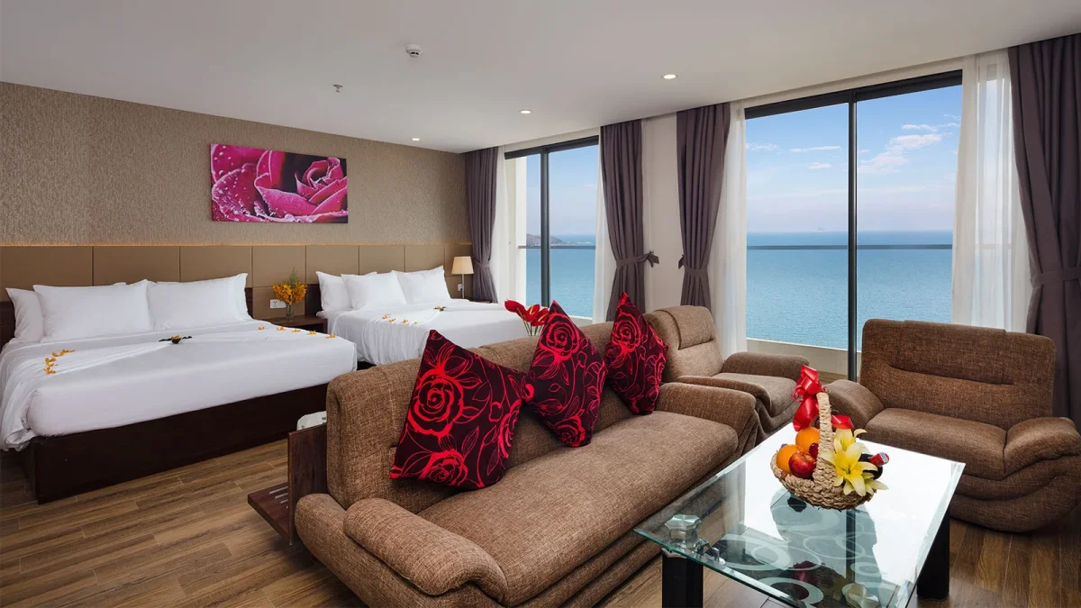 - Tầm nhìn ấn tượng: Khách sạn có các phòng với tầm nhìn hướng phố và đặc biệt là các hạng phòng cao cấp có view biển trực diện (Ocean View), cho phép bạn ngắm trọn vẹn vẻ đẹp của vịnh Nha Trang ngay từ ban công phòng.