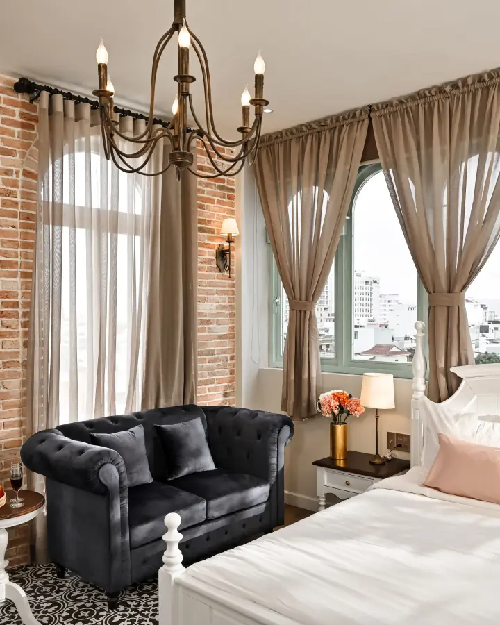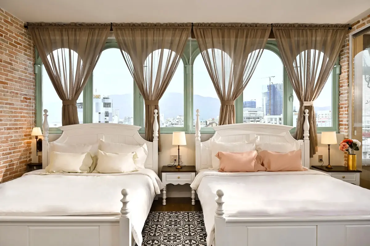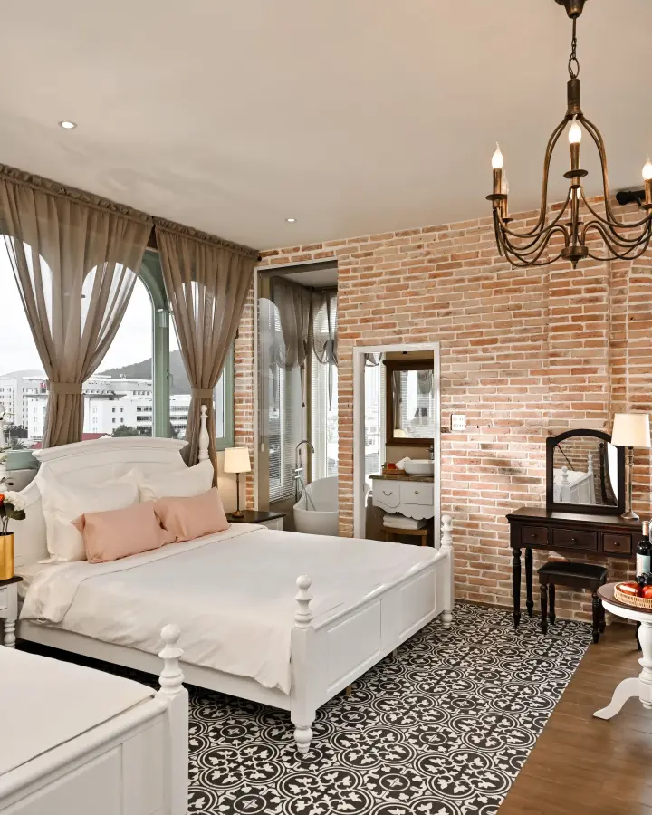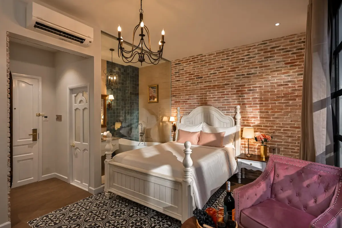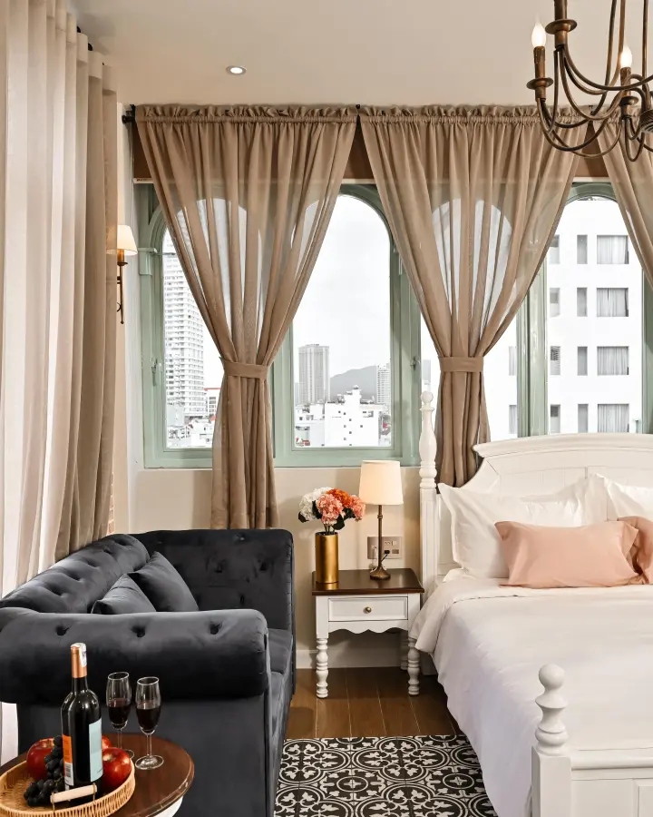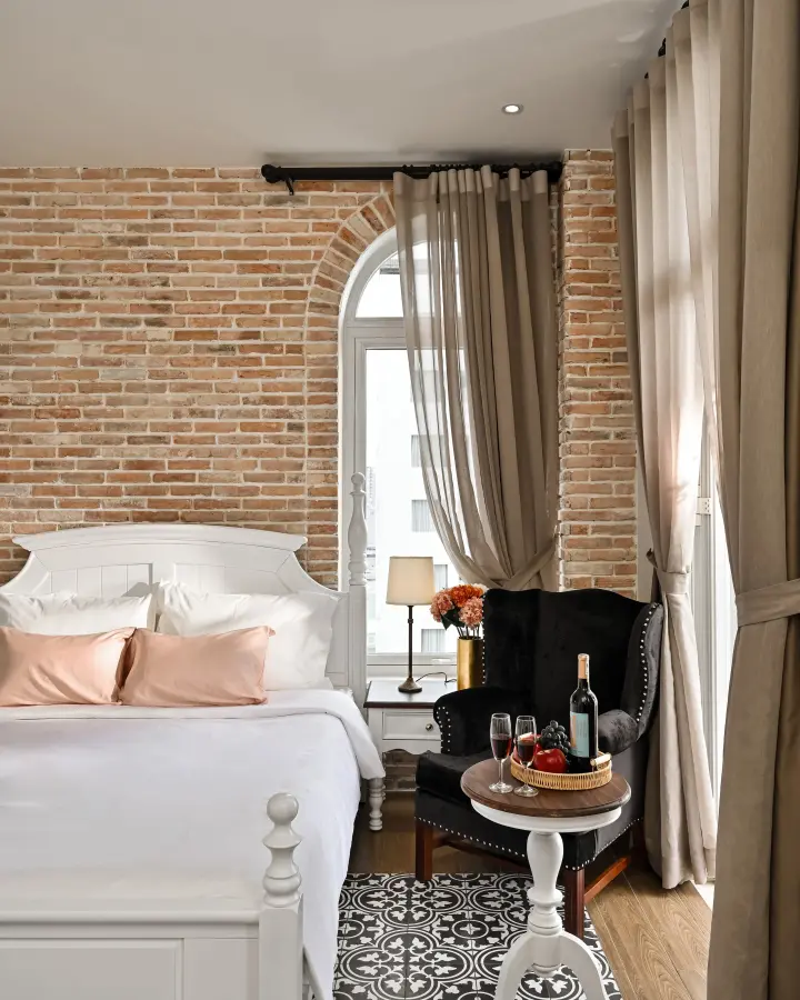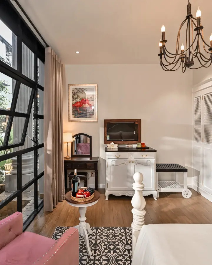 Khách sạn được thiết kế theo phong cách boutique hiện đại với tông màu trắng chủ đạo, kết hợp ánh sáng tự nhiên và các chi tiết trang trí tinh tế. Không gian chung thoáng đãng, có khu vườn nhỏ và sân hiên giúp khách có thể thư giãn.