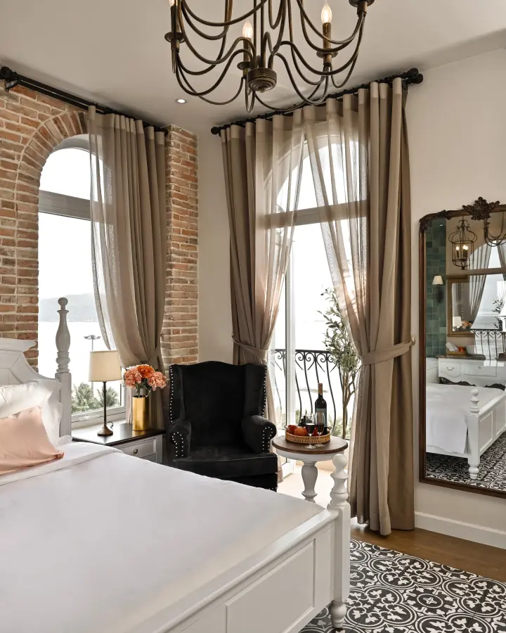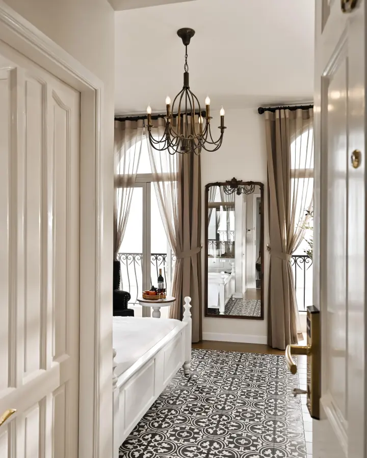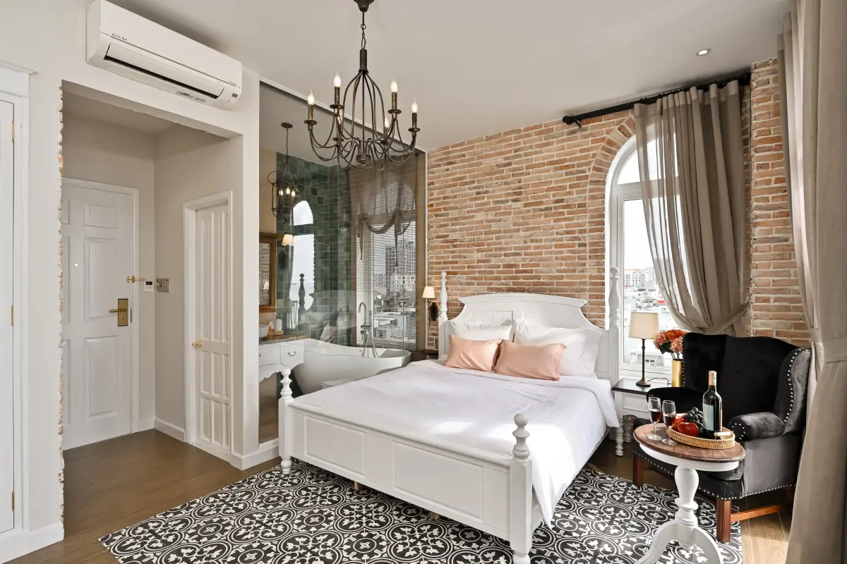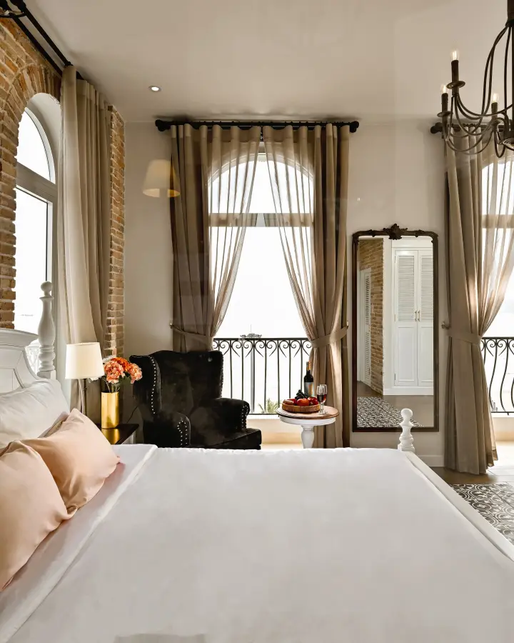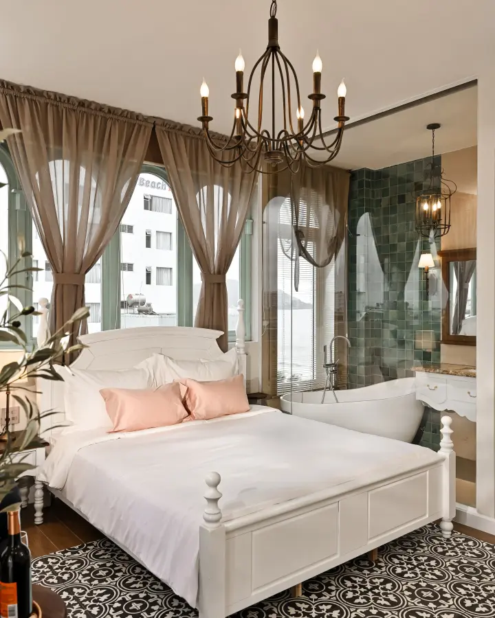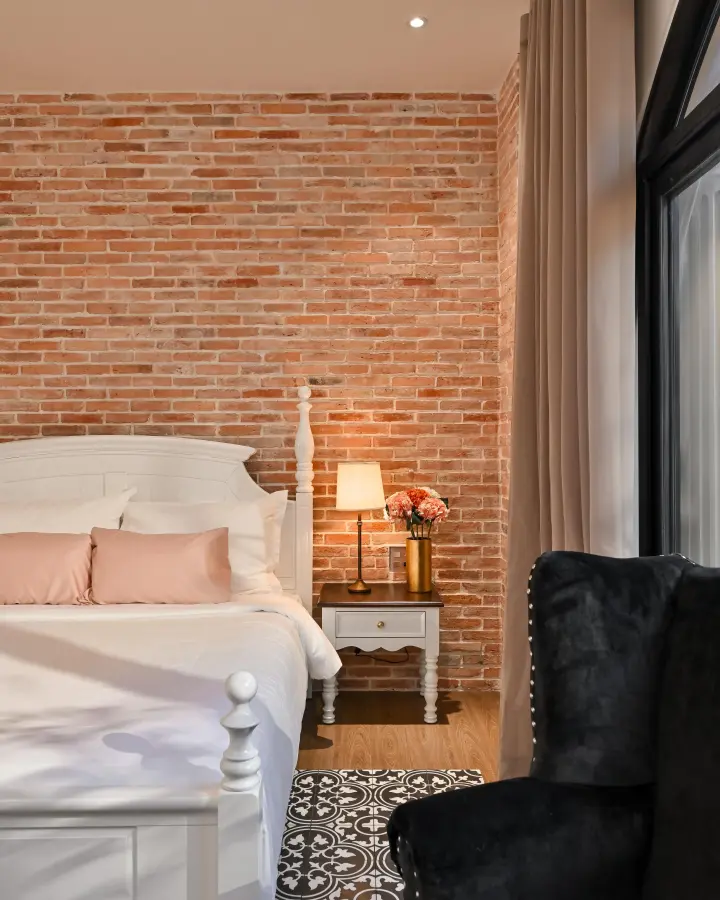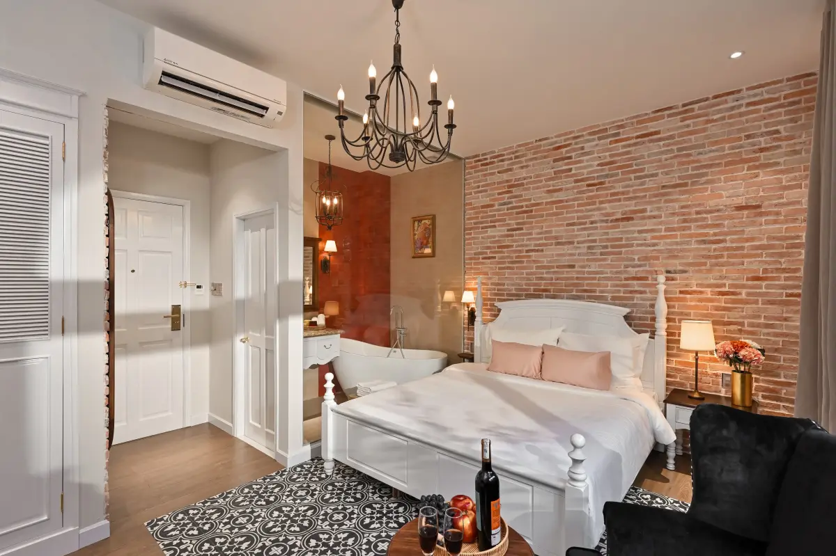 Khách sạn được thiết kế theo phong cách boutique hiện đại với tông màu trắng chủ đạo, kết hợp ánh sáng tự nhiên và các chi tiết trang trí tinh tế. Không gian chung thoáng đãng, có khu vườn nhỏ và sân hiên giúp khách có thể thư giãn.