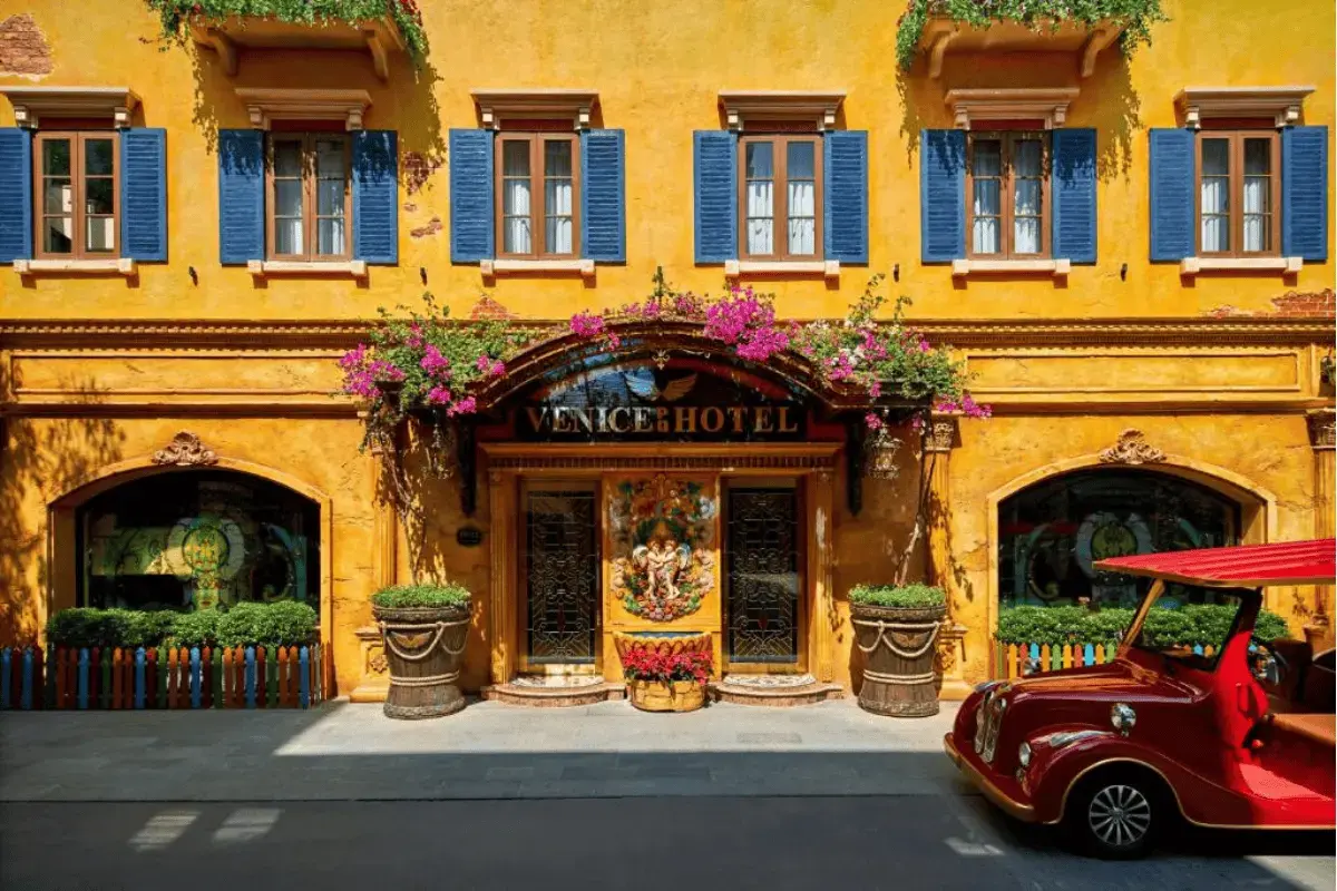 Venice Hotel Phú Quốc gây ấn tượng với kiến trúc lấy cảm hứng từ những ngôi làng ven biển Địa Trung Hải. Các gam màu ấm như vàng, cam, xanh biển kết hợp với những mái vòm cong, họa tiết mosaic và ban công rộng giúp không gian luôn tràn ngập ánh sáng tự nhiên. Các phòng nghỉ đều có cửa sổ lớn hoặc ban công riêng, tạo cảm giác thoáng đãng và thư giãn.