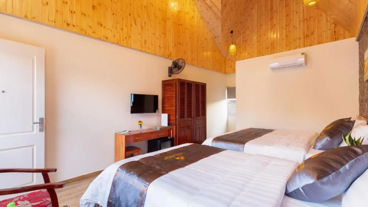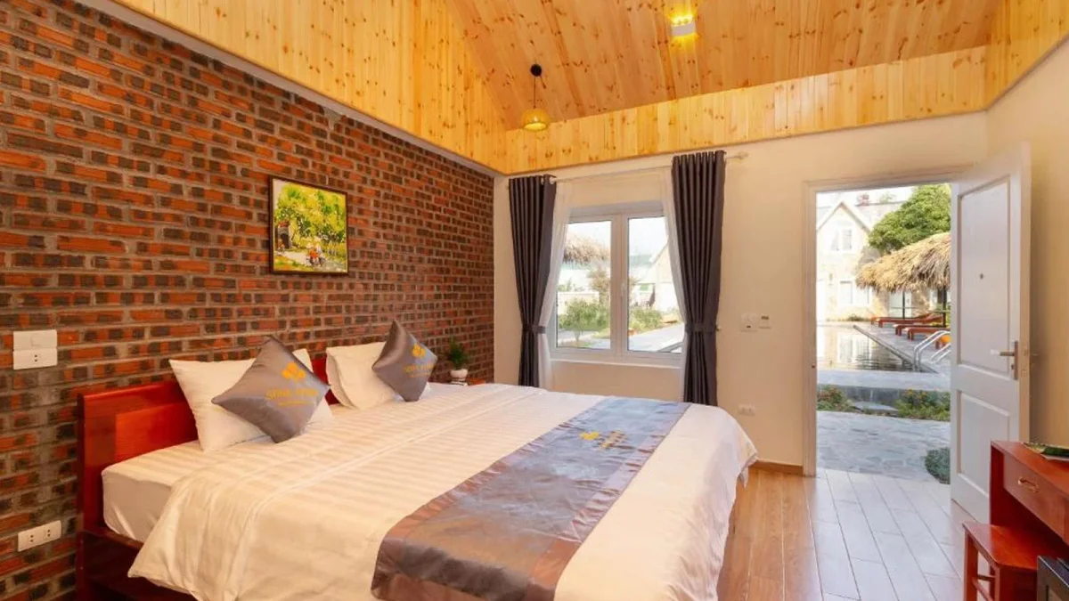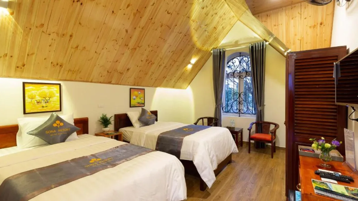 sona resort được thiết kế theo phong cách kết hợp hiện đại và truyền thống, với vật liệu chủ yếu là gỗ và đá, mang đến cảm giác ấm cúng và gần gũi với thiên nhiên. các phòng nghỉ tại đây đều có tầm nhìn đẹp ra vườn hoặc núi, đặc biệt là phòng deluxe và family với diện tích rộng rãi, phù hợp cho gia đình hoặc nhóm bạn.