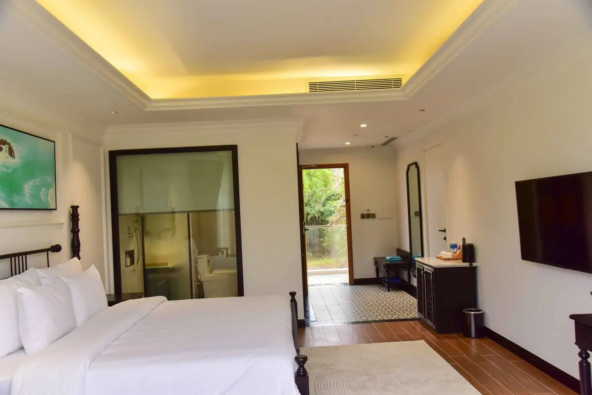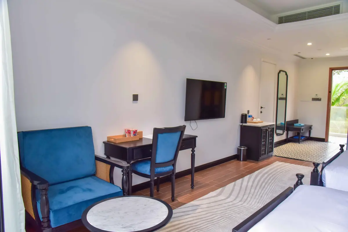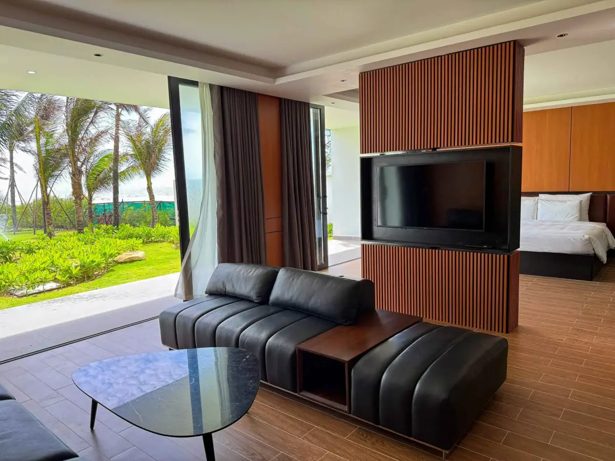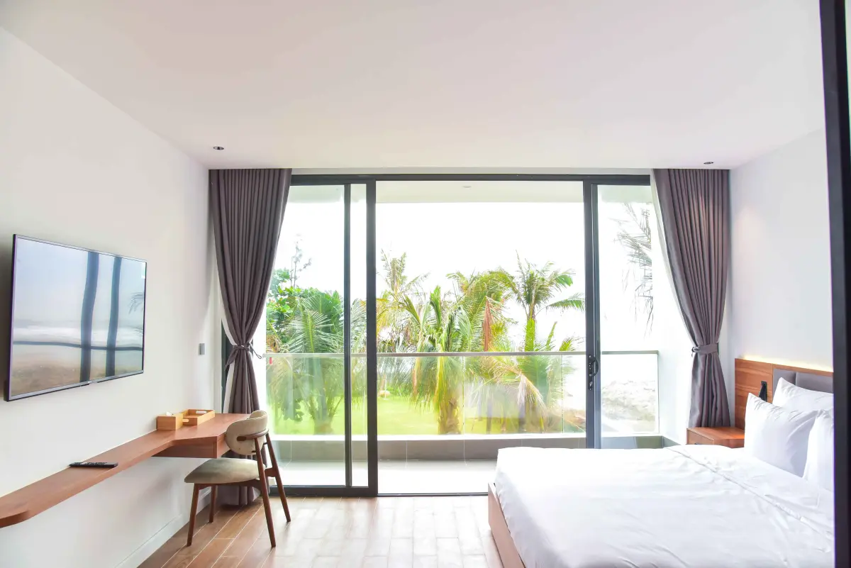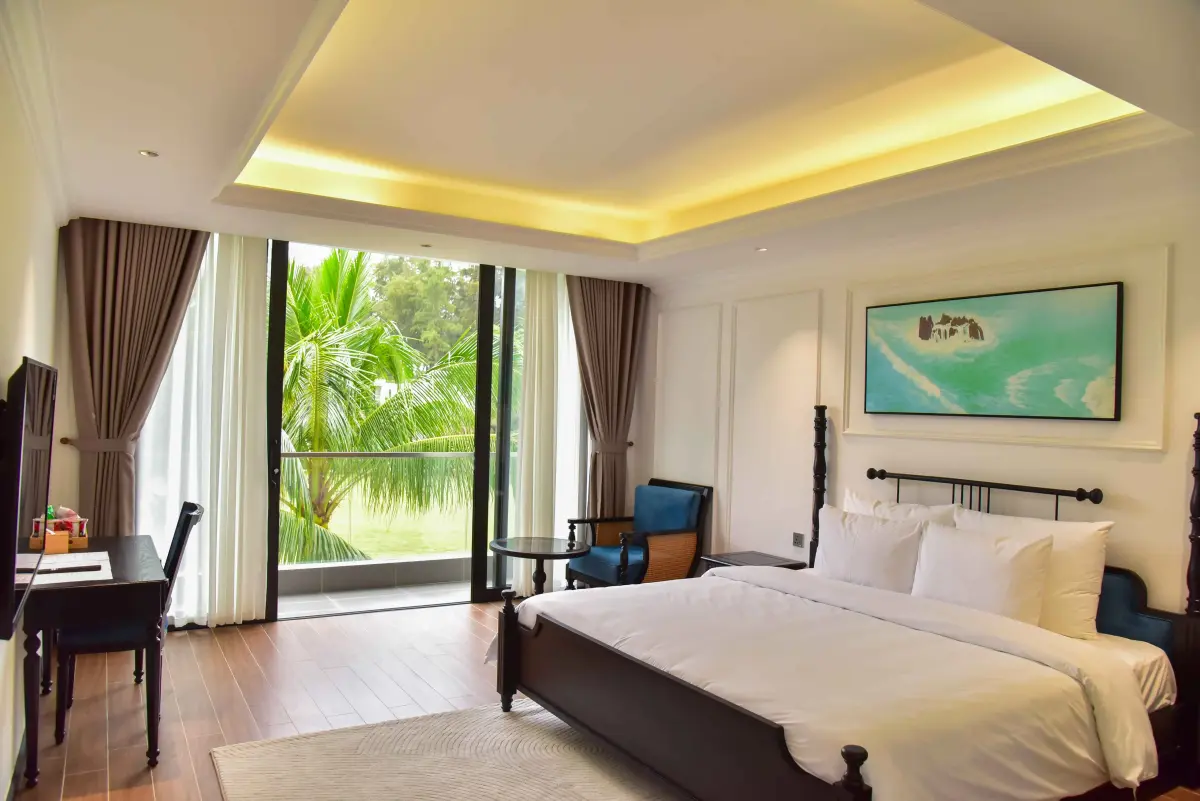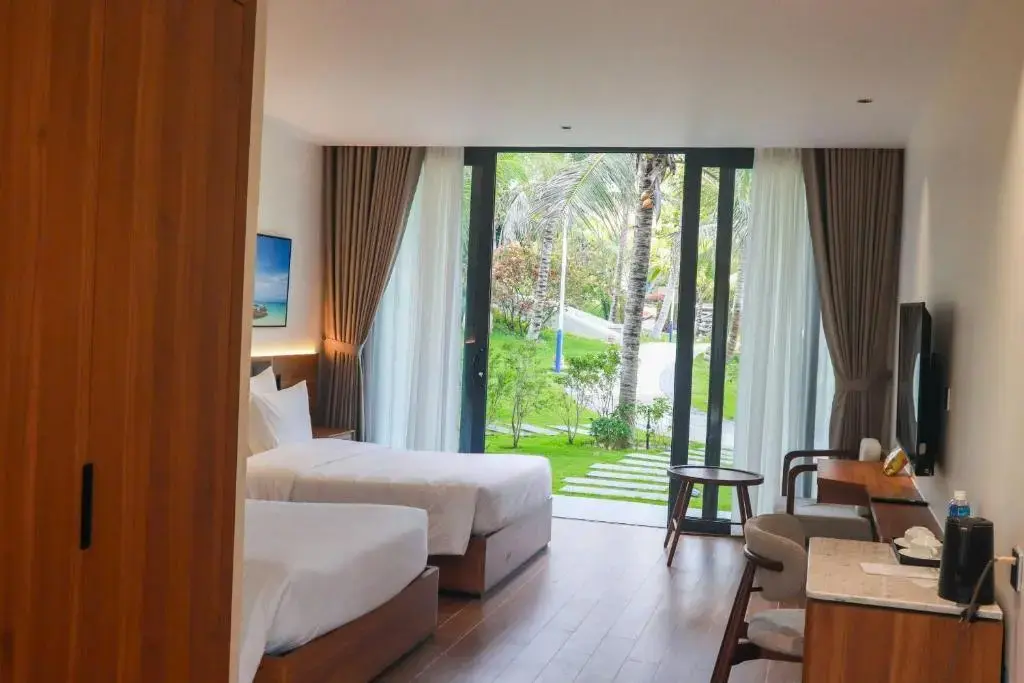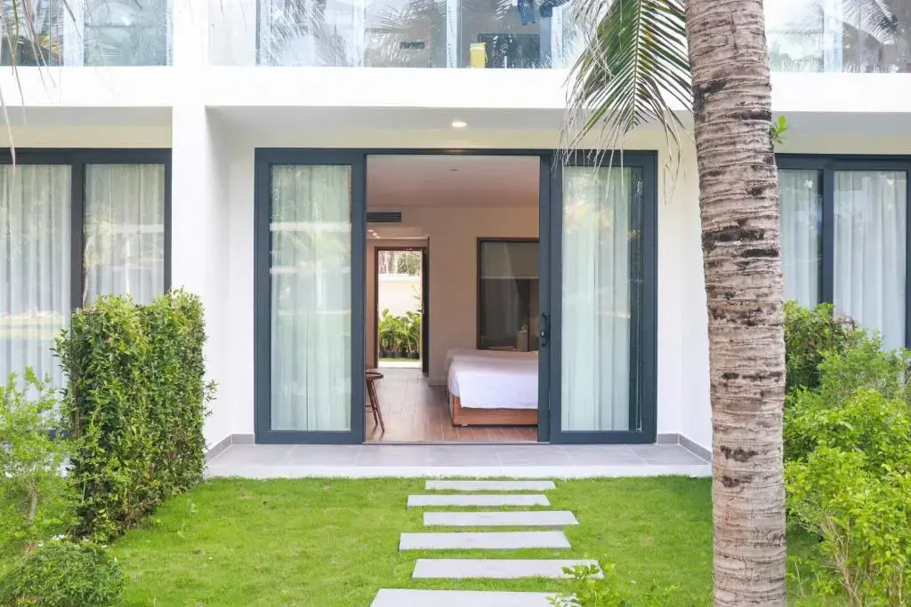 Khu resort được bao quanh bởi cây xanh và những lối đi rợp bóng dừa. Phòng nghỉ chủ yếu là bungalow hoặc villa riêng biệt, tường trắng mái ngói nâu, thiết kế kiểu hiện đại pha chút mộc mạc. Hầu hết phòng đều có ban công riêng hoặc khoảng sân nhỏ nhìn ra vườn hoặc biển, buổi sáng chỉ cần mở cửa là nghe tiếng sóng.
