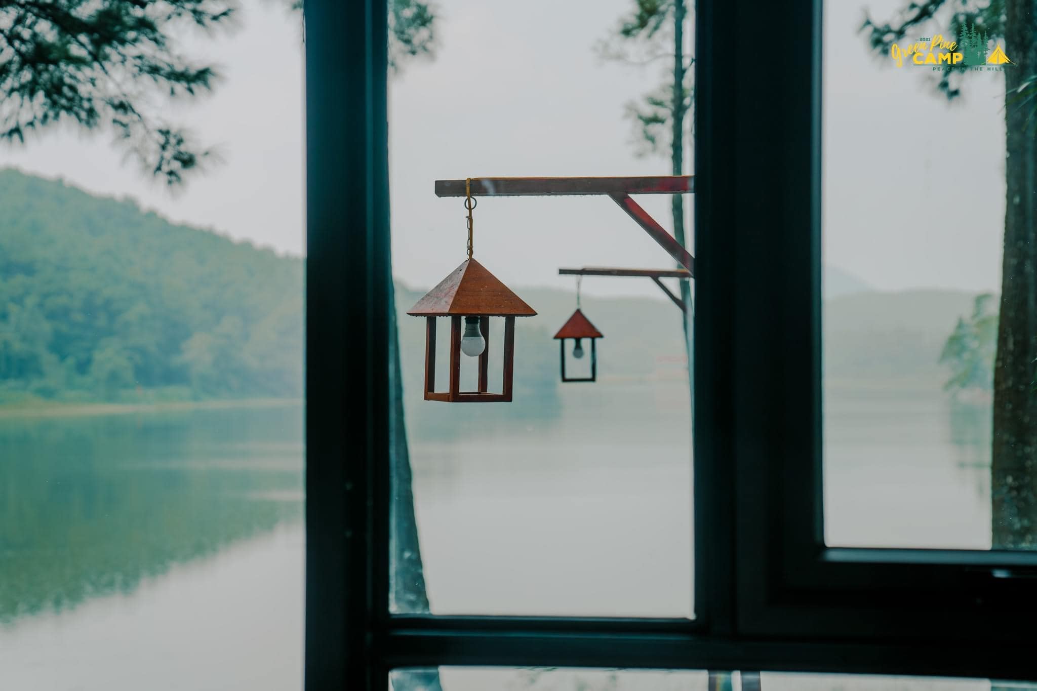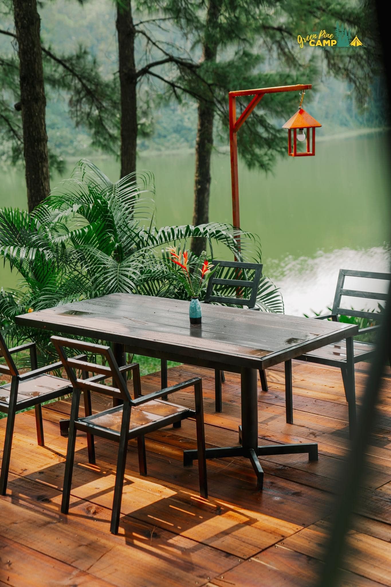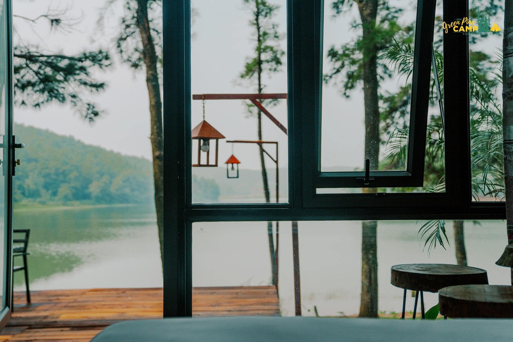 - Điểm nhấn lãng mạn: Bàn trà và khoảnh hiên rộng rãi hướng thẳng ra mặt hồ Đồng Chương, nằm dưới tán thông rợp mát. Đây là nơi hoàn hảo để nhâm nhi cà phê, đọc sách hoặc ngắm cảnh bình minh/hoàng hôn.