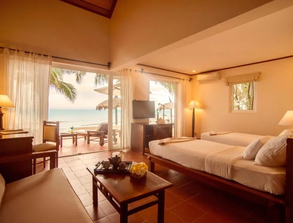 Beach Front Bungalow (71m²) có vị trí chỉ cách biển vài bước chân. Từ sân hiên, bạn nghe được tiếng sóng vỗ rõ ràng. Buổi sáng kéo rèm ra là nhìn thấy biển, buổi tối ngồi trên ghế bố thưởng thức ly rượu vang cũng nhìn thấy biển – trải nghiệm này khiến nhiều du khách không muốn rời khỏi phòng.