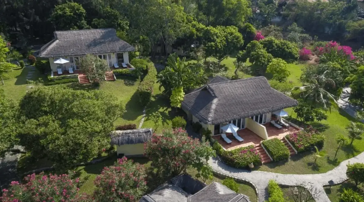 Thay vì những tòa nhà cao tầng hay villa hiện đại, Victoria chọn phong cách bungalow mái lá kết hợp kiến trúc Đông Dương. Mỗi căn bungalow là một ngôi nhà nhỏ độc lập, mái lợp tranh, tường sơn màu trầm, cửa gỗ chạm khắc tinh xảo. Đây là phong cách kiến trúc quen thuộc với những ai từng đến Hội An hay các làng quê miền Trung, nhưng được nâng cấp lên mức resort cao cấp.